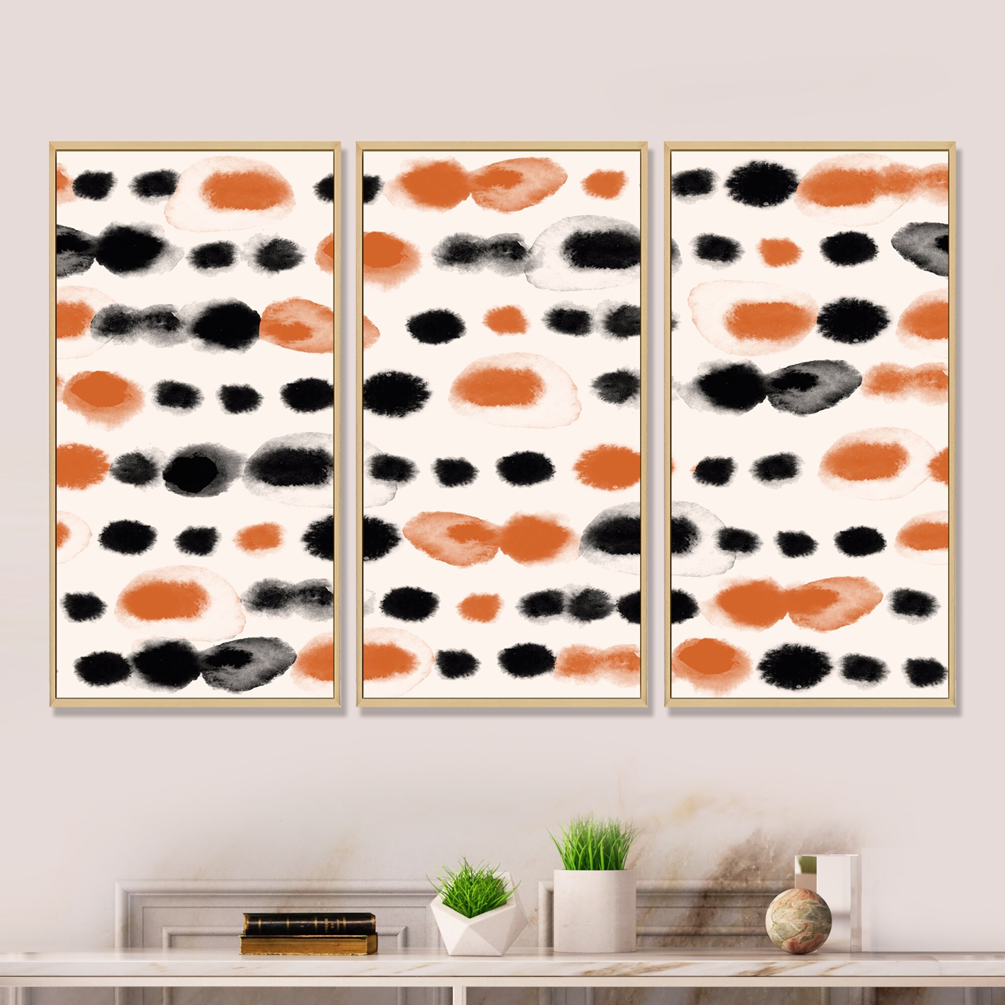 Designart "Black and Orange Polka Dots" Modern Framed Art Set of 3 - 4 Colors of Frames