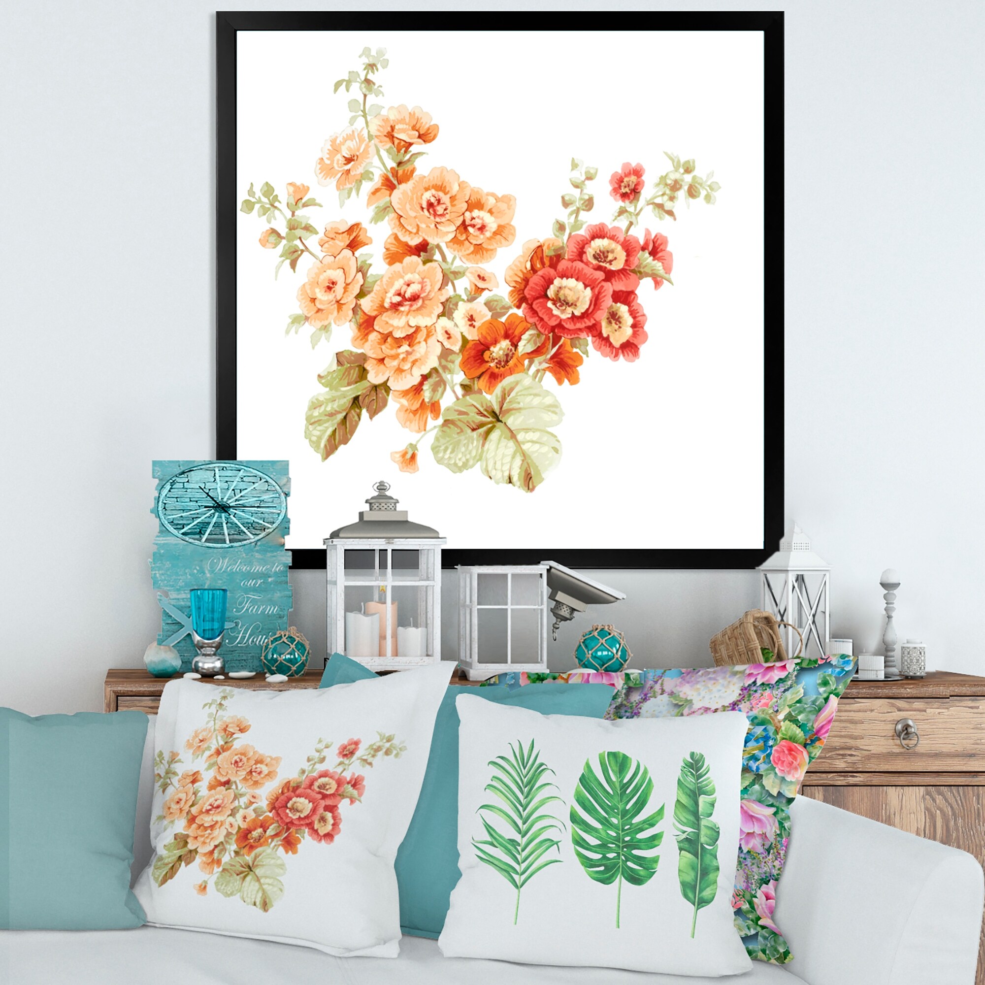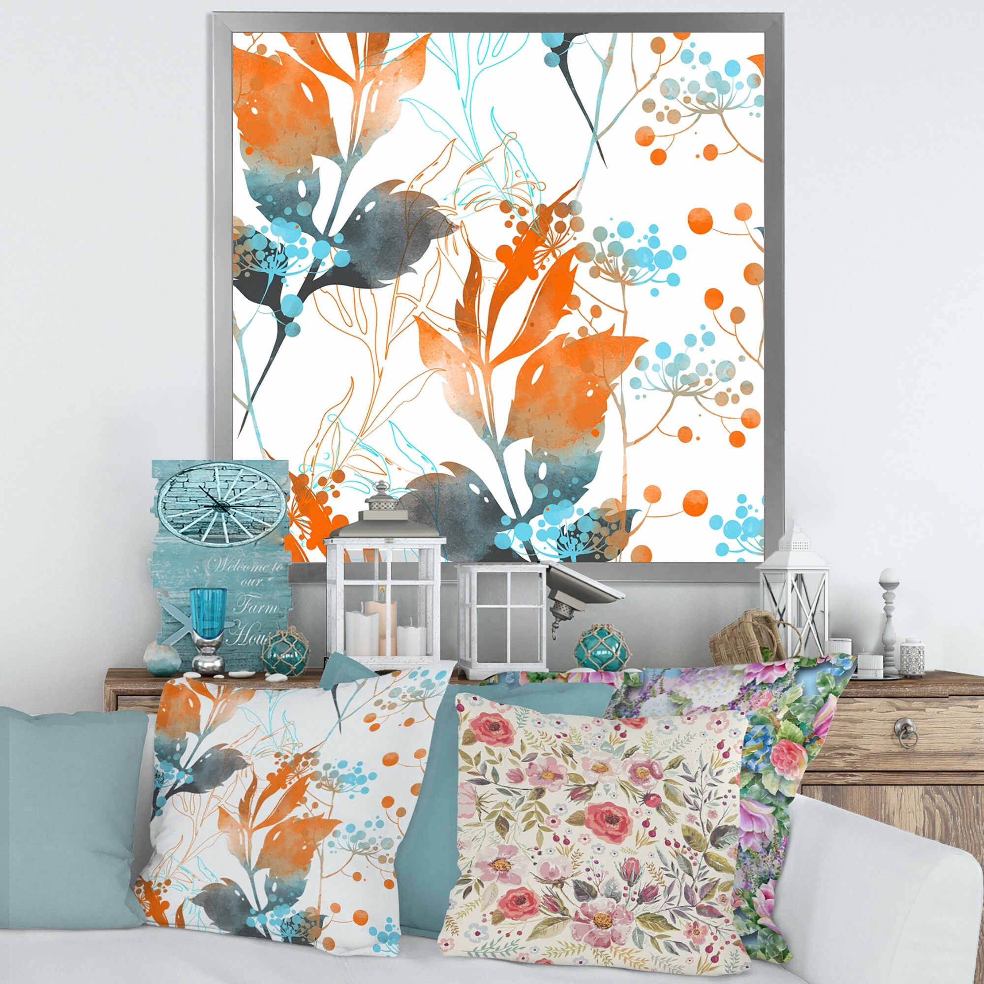 Designart "Boho Orange And Blue Leaves" Traditional Framed Art Print