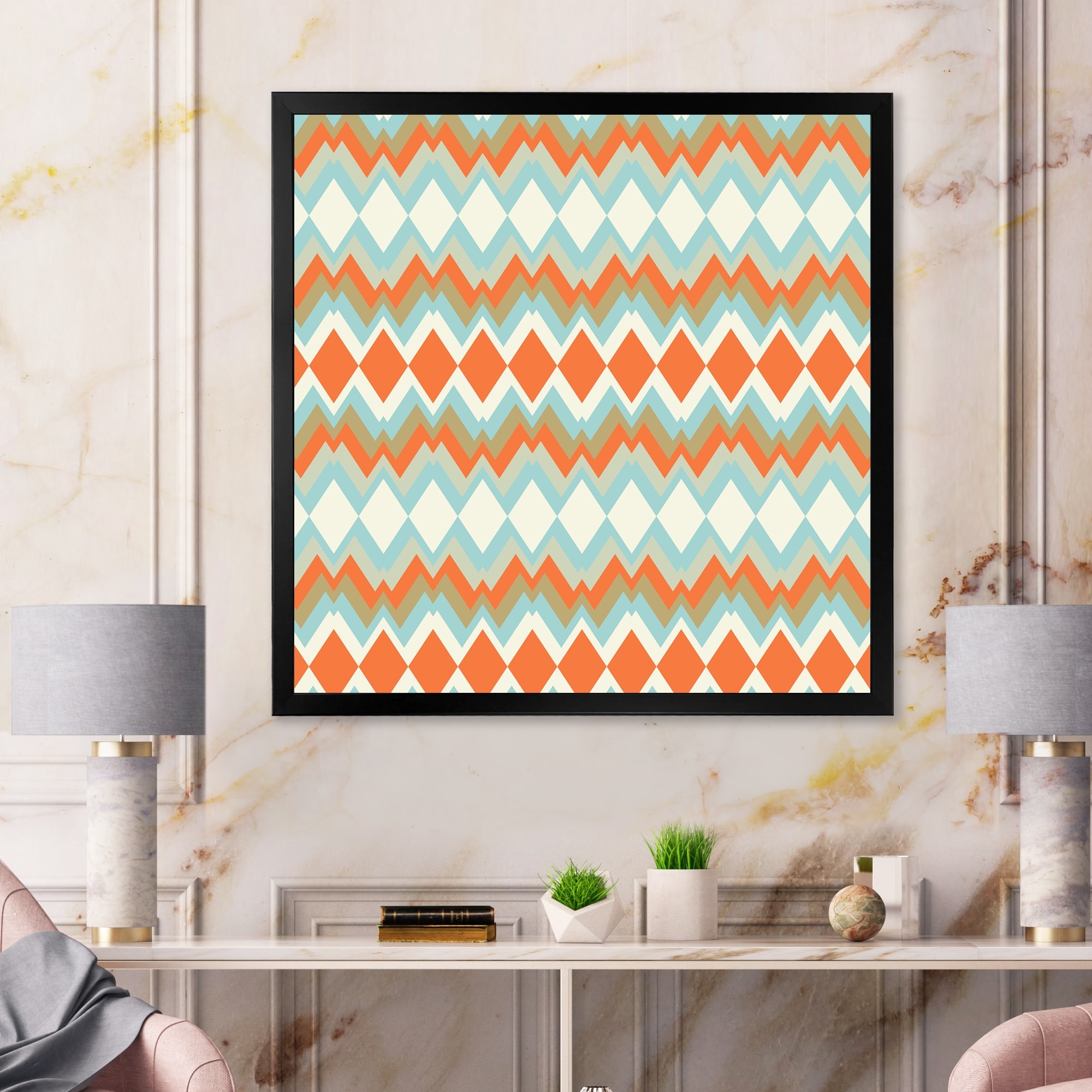 Designart "Ethnic Zigzag in Blue And Orange" Patterned Framed Art Print