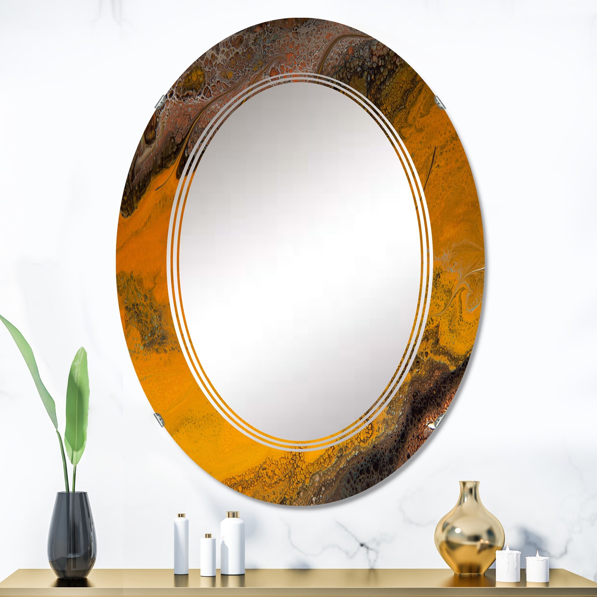 Designart 'Orange And Black Marble Waves' Printed Modern Wall Mirror