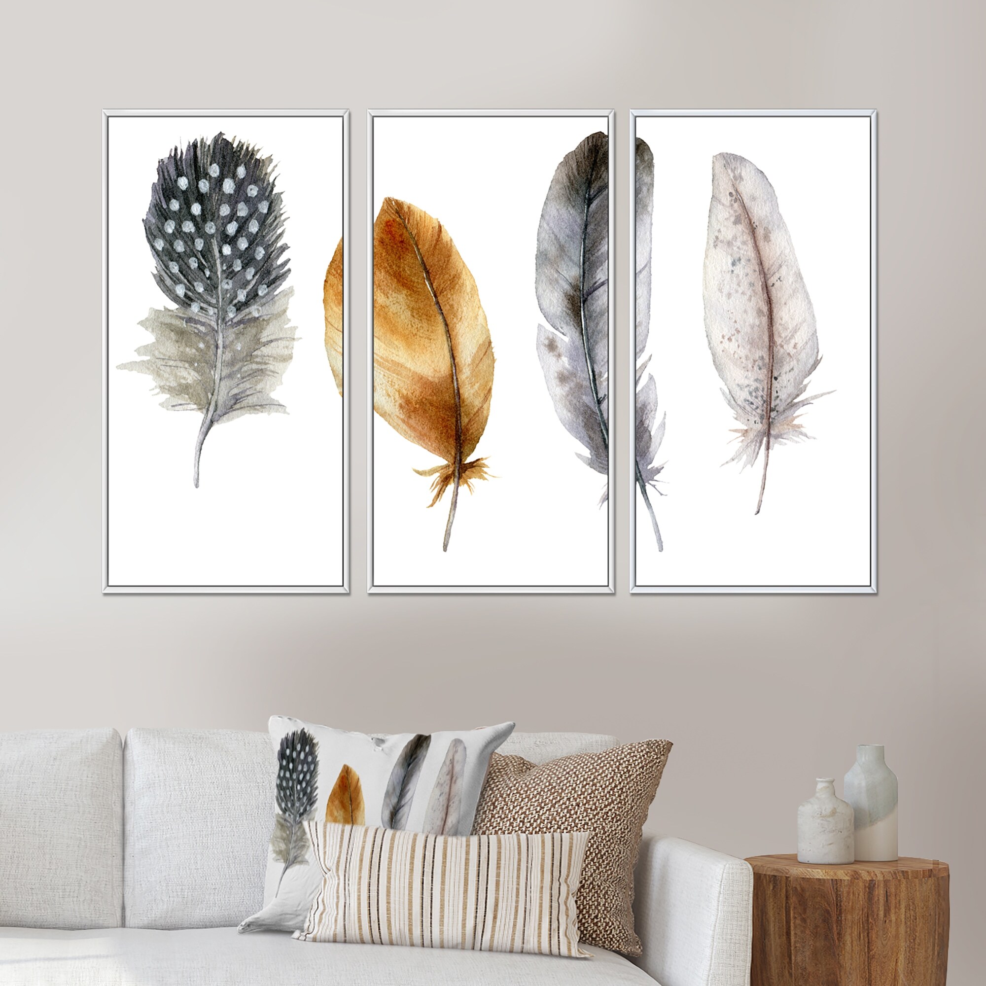 Designart "Boho Feather in Orange & Blue Striped & Polka Dost" Bohemian & Eclectic Framed Canvas Wall Art Print - 3 Panels