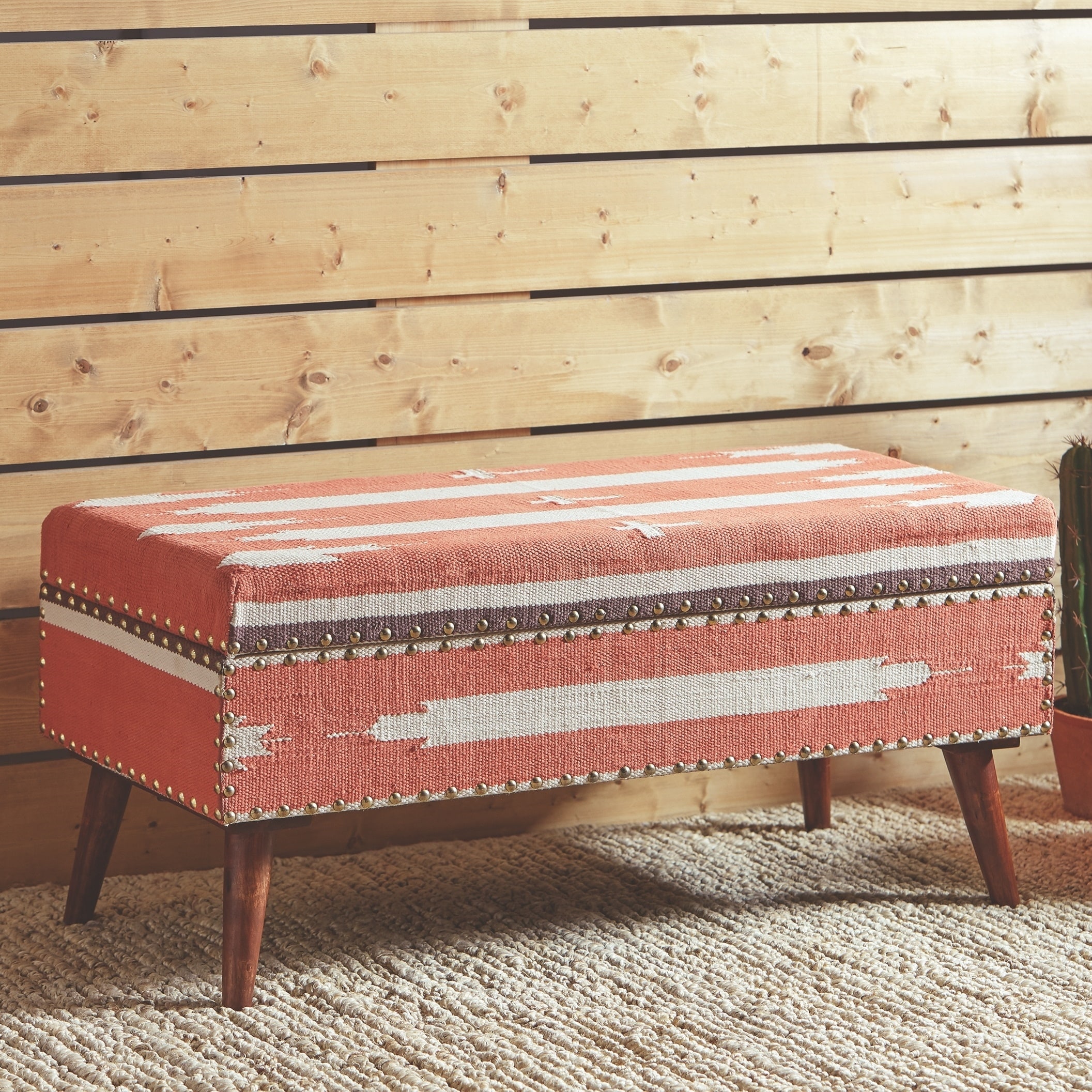 Modern Eclectic Design Orange and Beige Storage Ottoman Bench