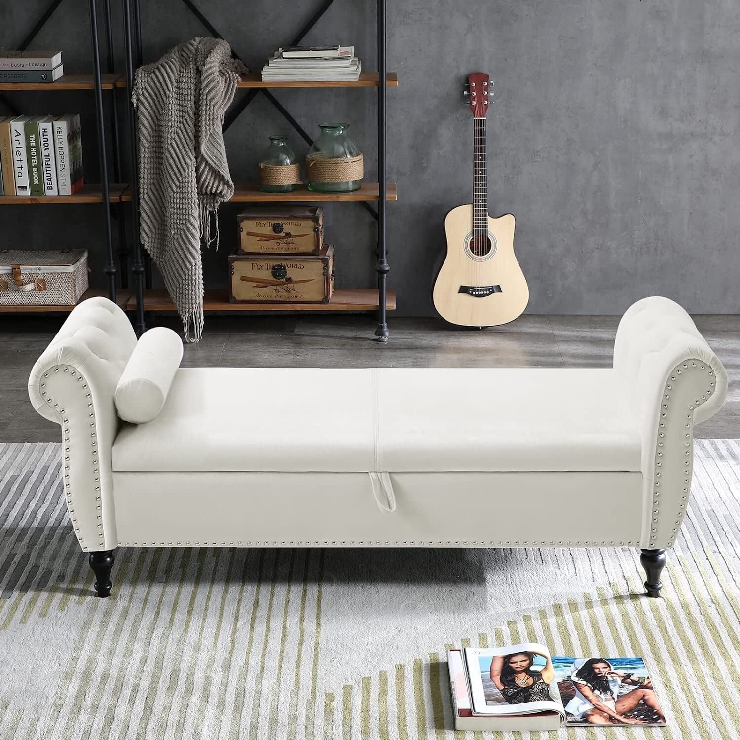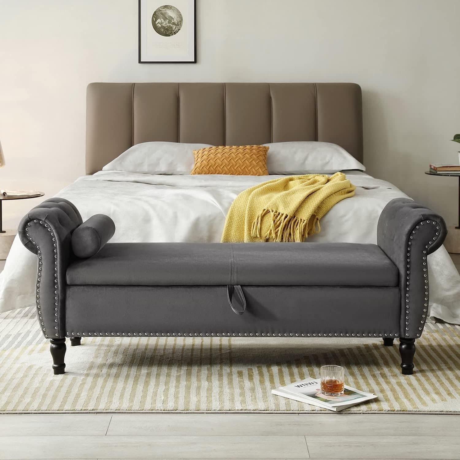 Contemporary Upholstered Storage Ottoman Bench with Rolled Arms