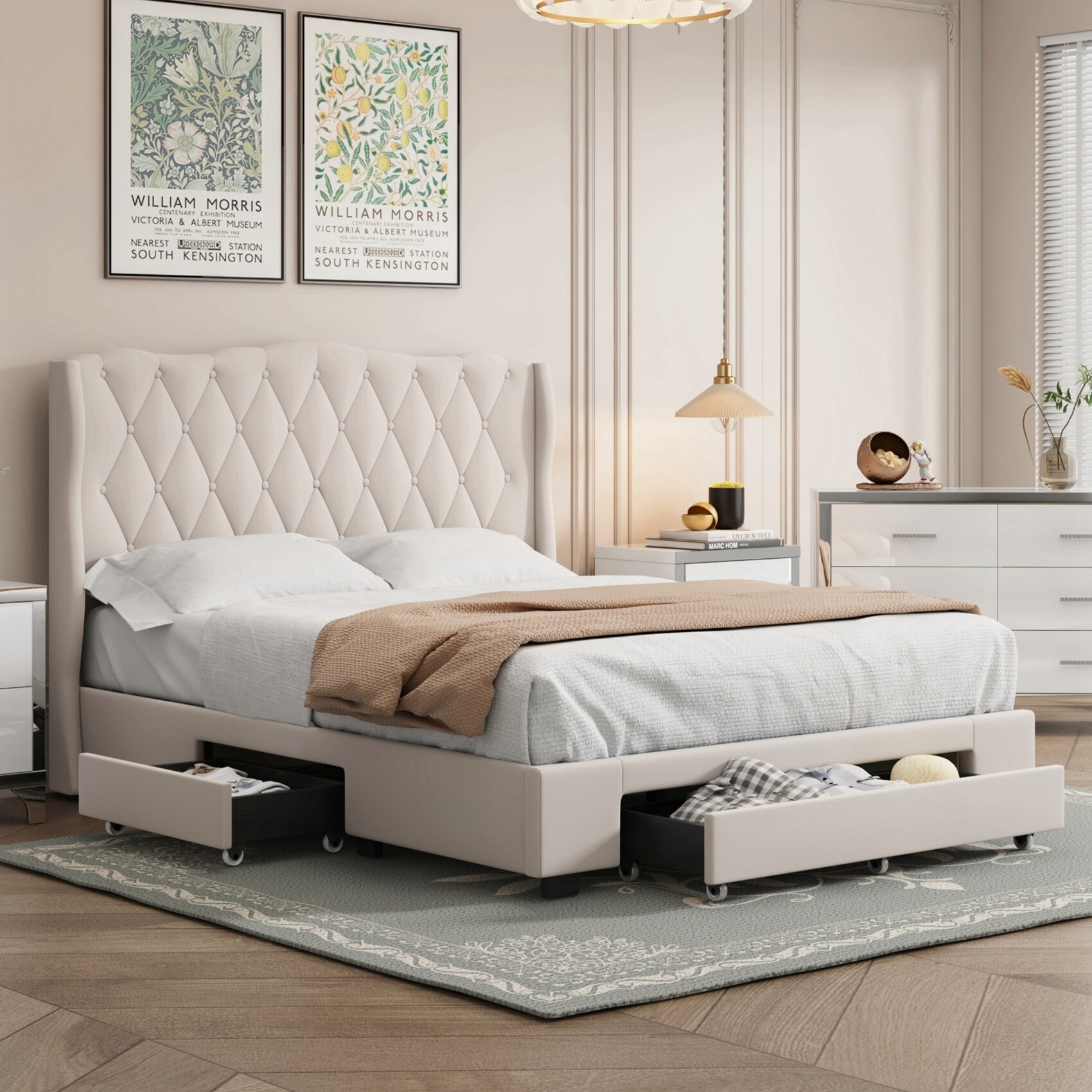 Queen Size Ivory Boucle Upholstered Platform Bed with 4 Storage Drawers, Tufted Headboard