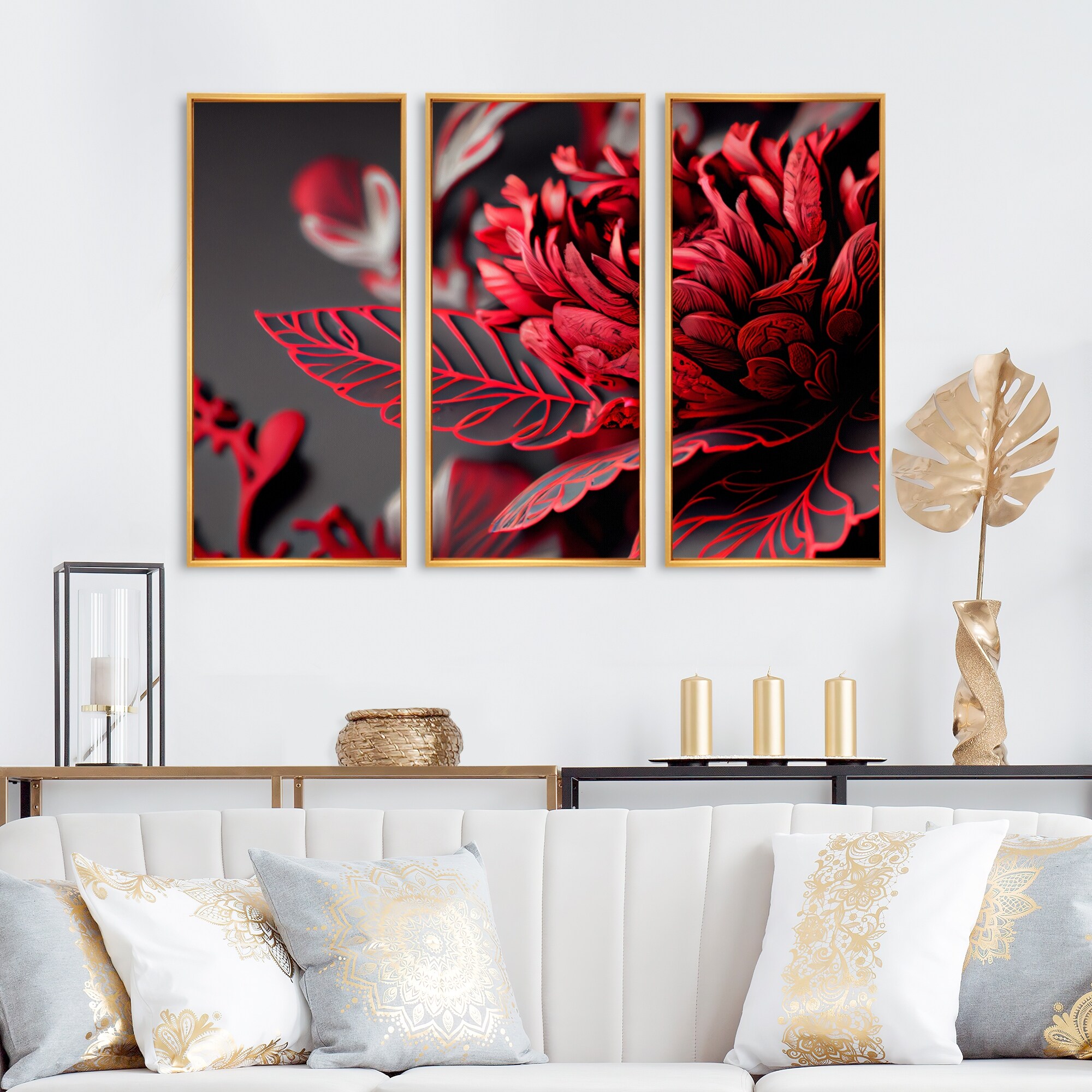 Designart "Blossoming Rose in Red And Gray II" Floral Framed Canvas Wall Art Print - 3 Panels
