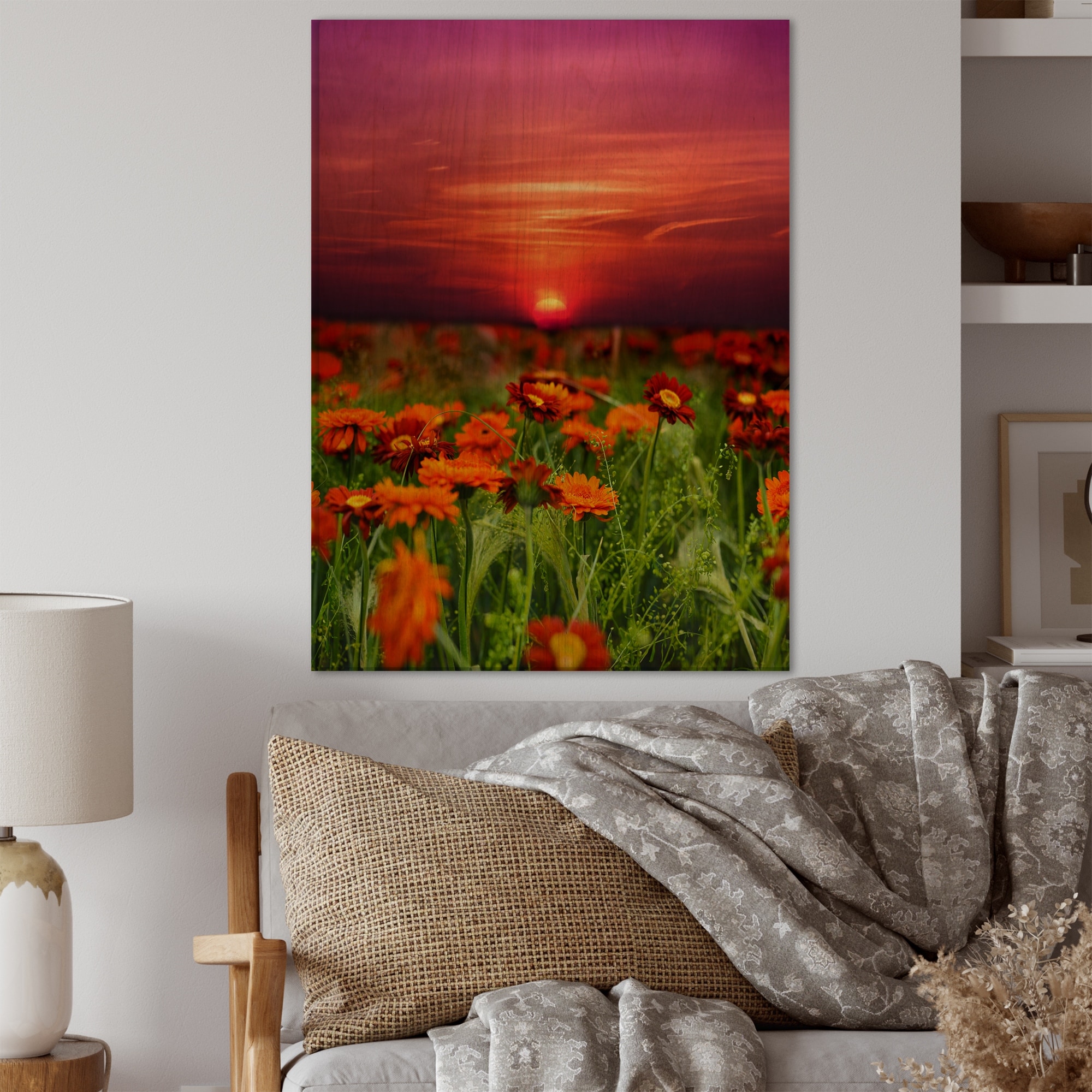 Designart 'Sunset Flowers With Red Sky' Country Wood Wall Art Décor - Natural Pine Wood
