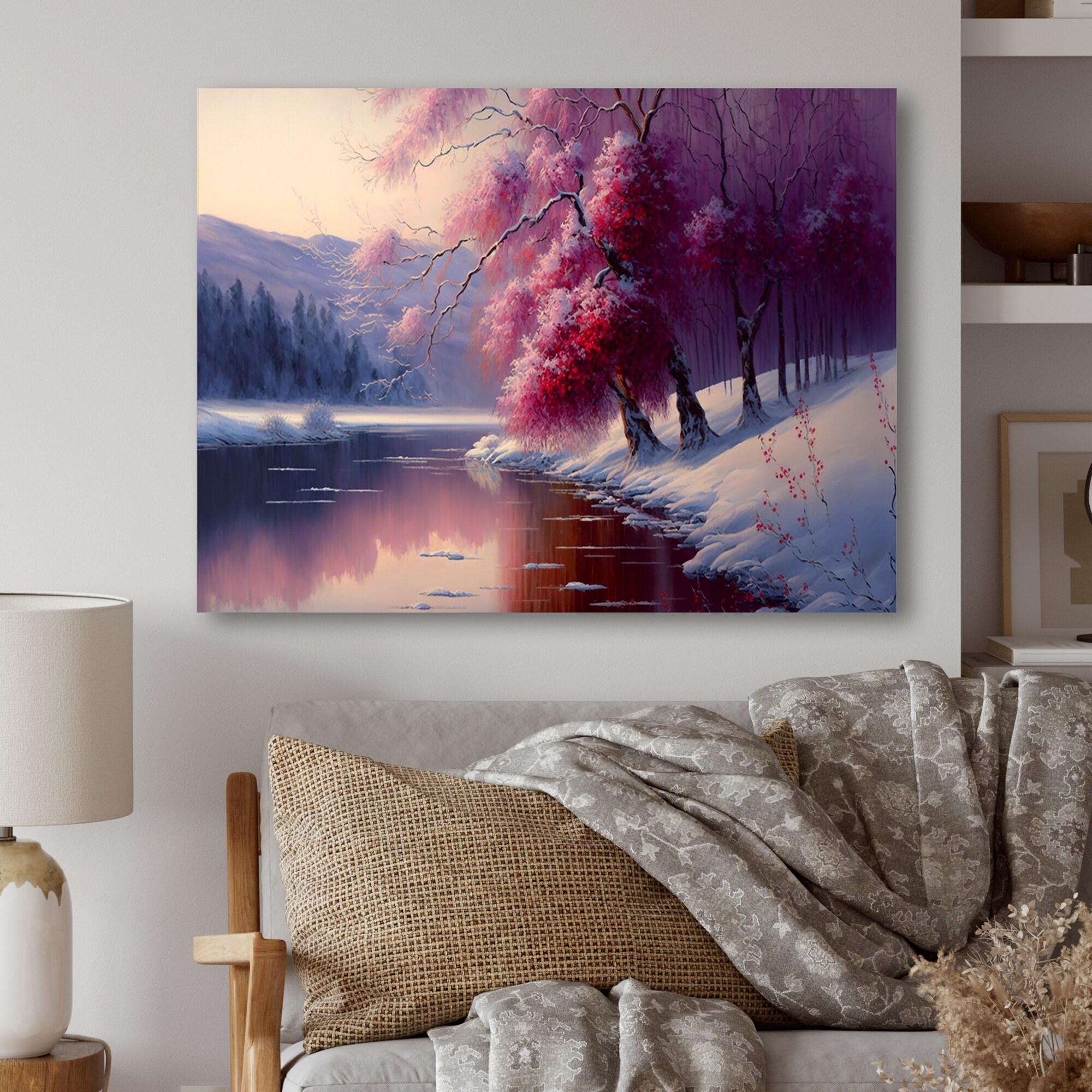 Designart "White Snowy Trees By the the River At Red Sunset III" Landscape Lake River Metal Wall Art