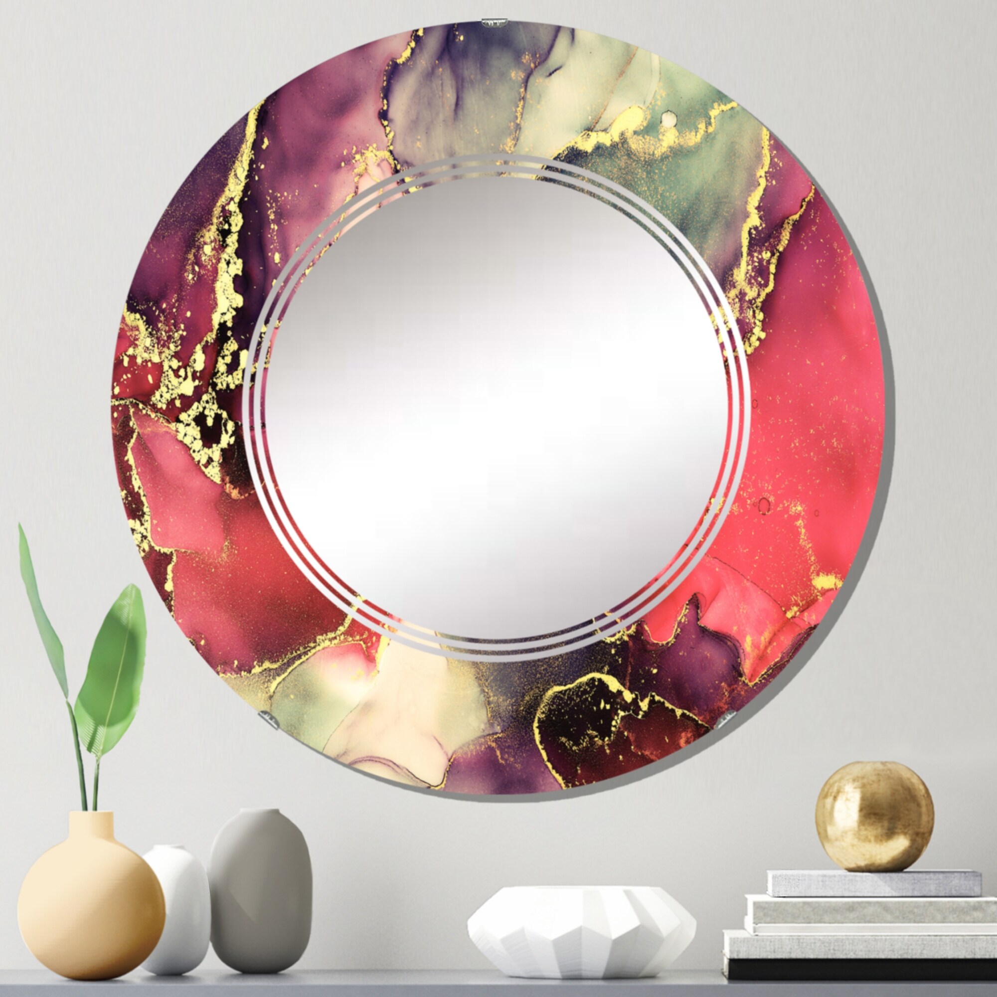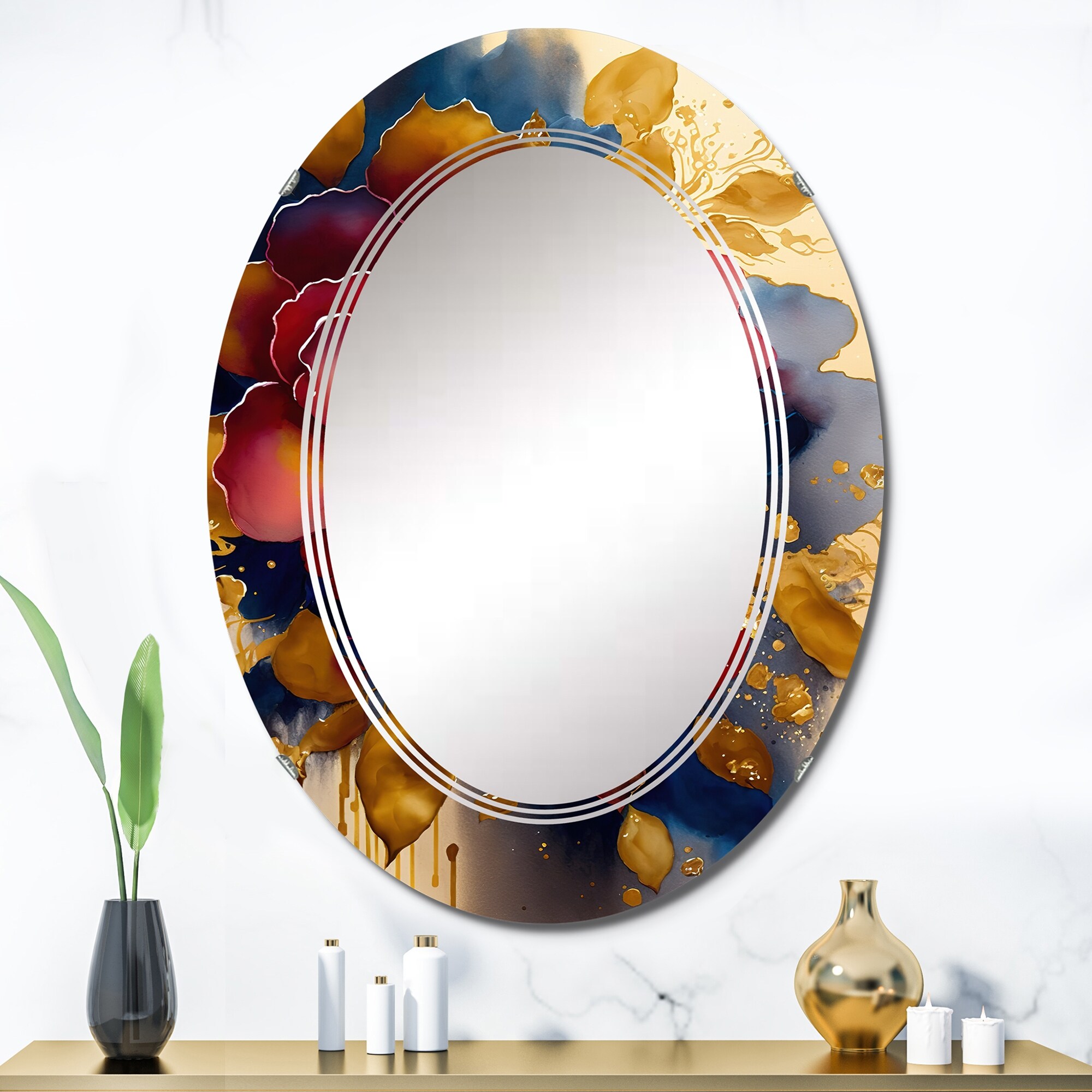 Designart 'Red And Gold Camellia Floral Design II' Printed Floral Camellia Wall Mirror