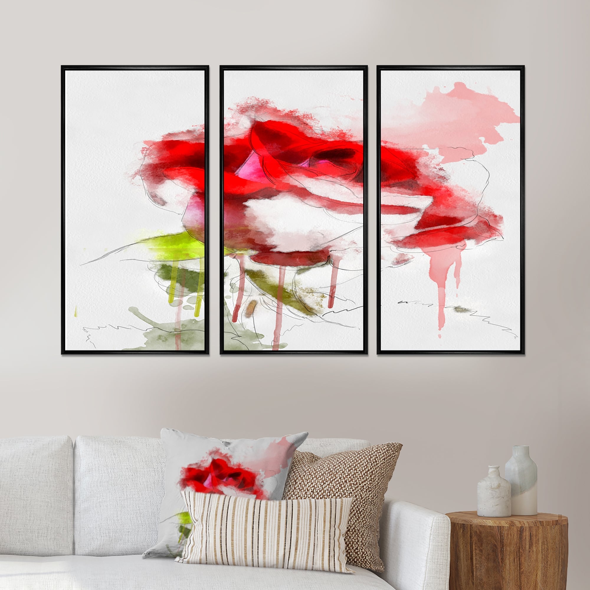 Designart "Red Rose Sketch with Red Splashes" Floral Framed Wall Art Set of 3 - 4 Colors of Frames