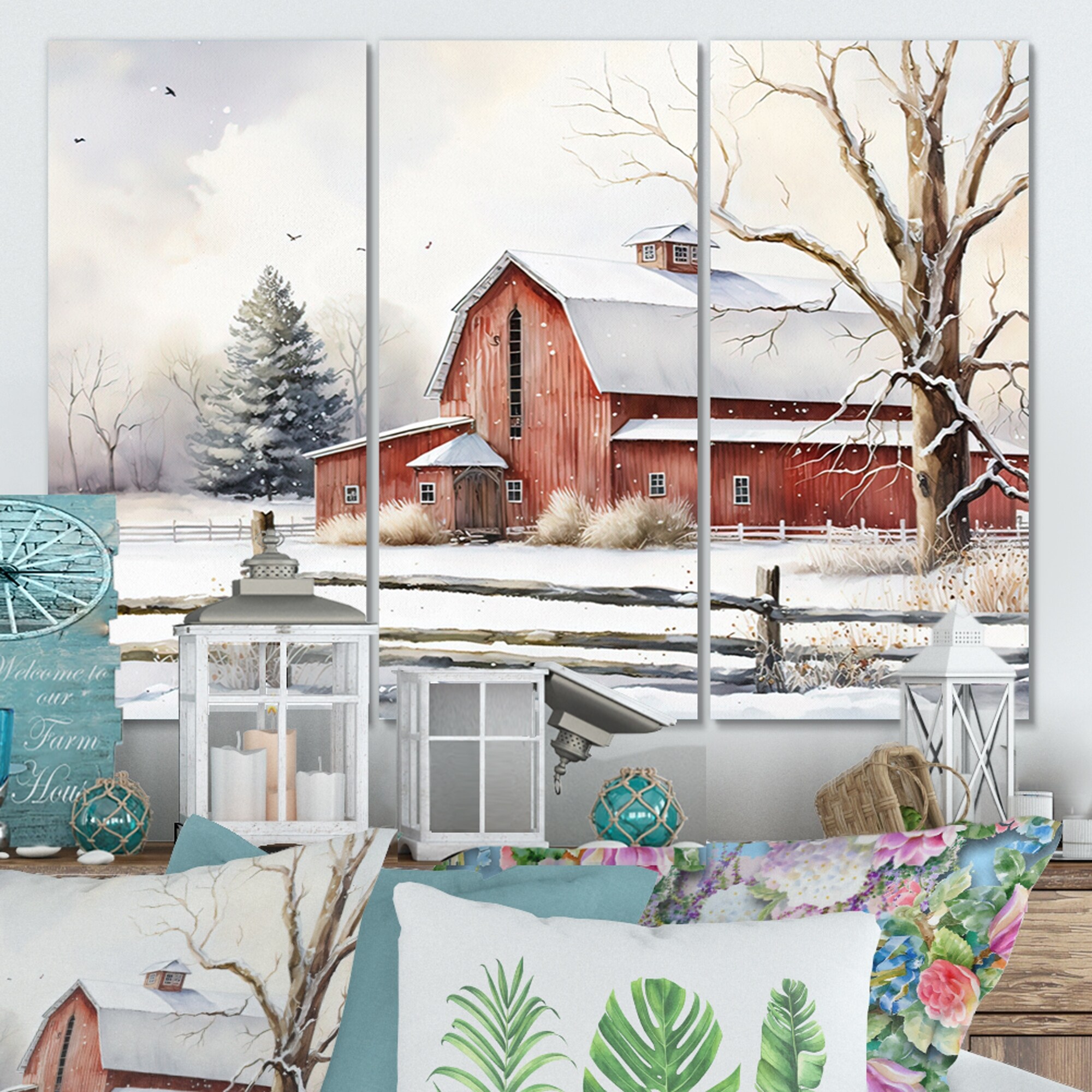 Designart "Calm Red Barn in Winter II" Farmhouse / Country Canvas Wall Art - 3 Panels