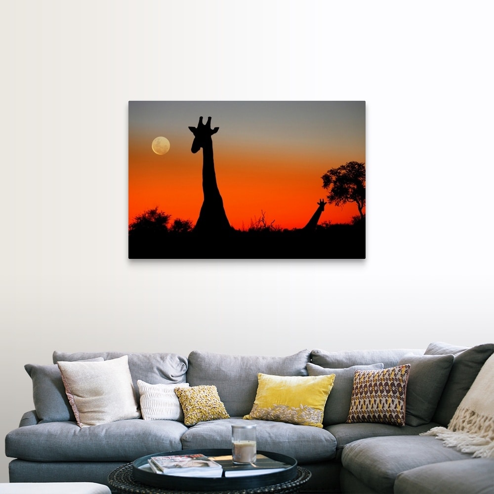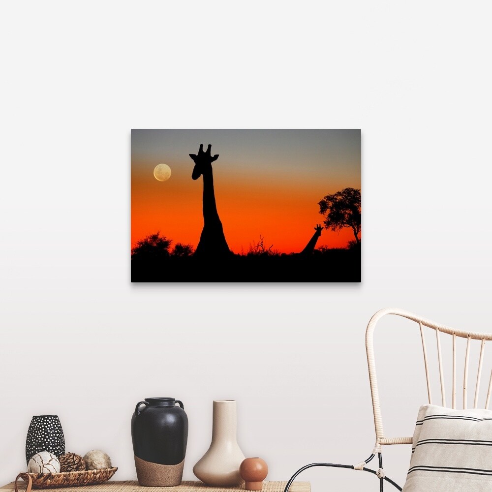 "Two Giraffes in the Savuti area of Botswana as the sun sets and the moon rises" Canvas Wall Art