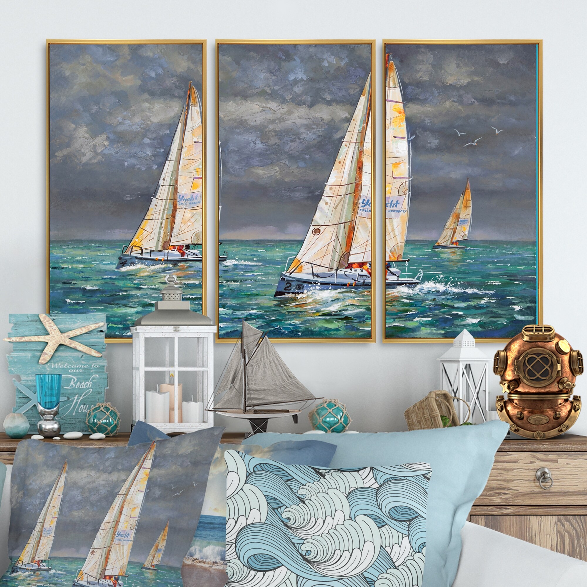Designart "Regatta Sailboats Arriving At the Finish I" Nautical & Coastal Framed Art Set of 3 - 4 Colors of Frames