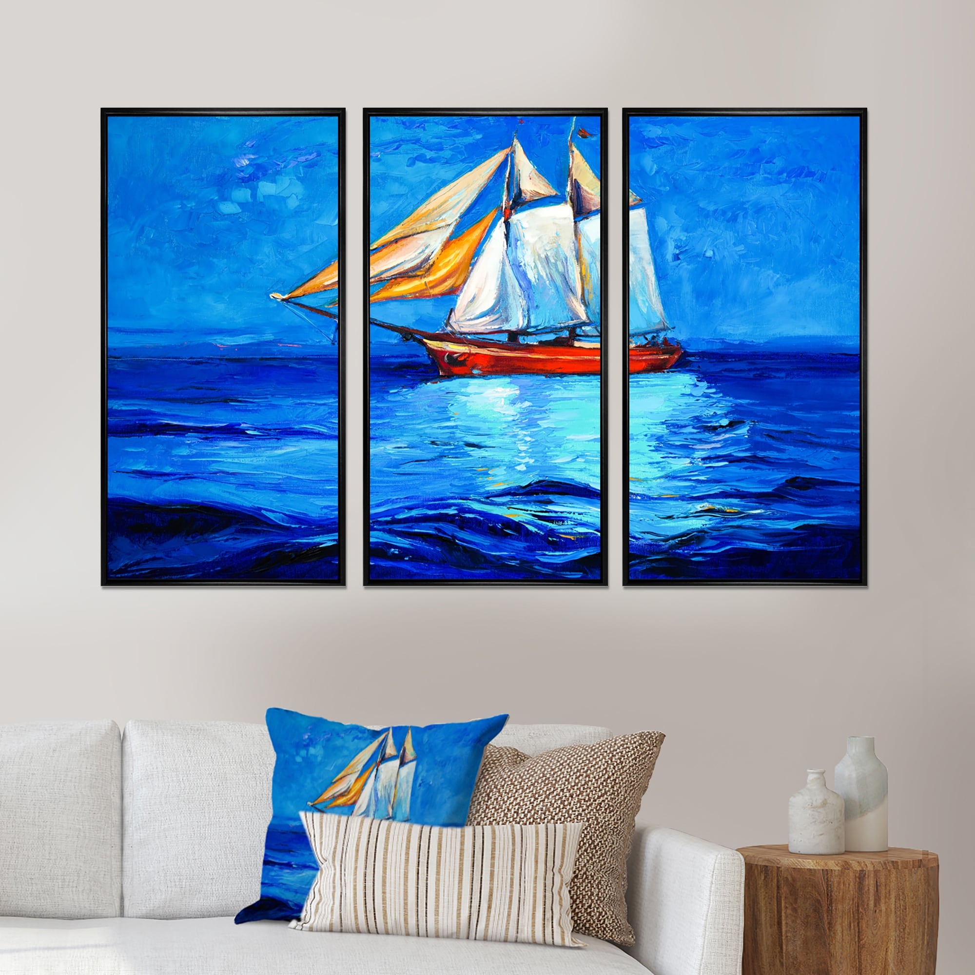 Designart "A Moody Seascape With A Sailboat With Sails" Nautical & Coastal Framed Wall Art Set of 3 - 4 Colors of Frames