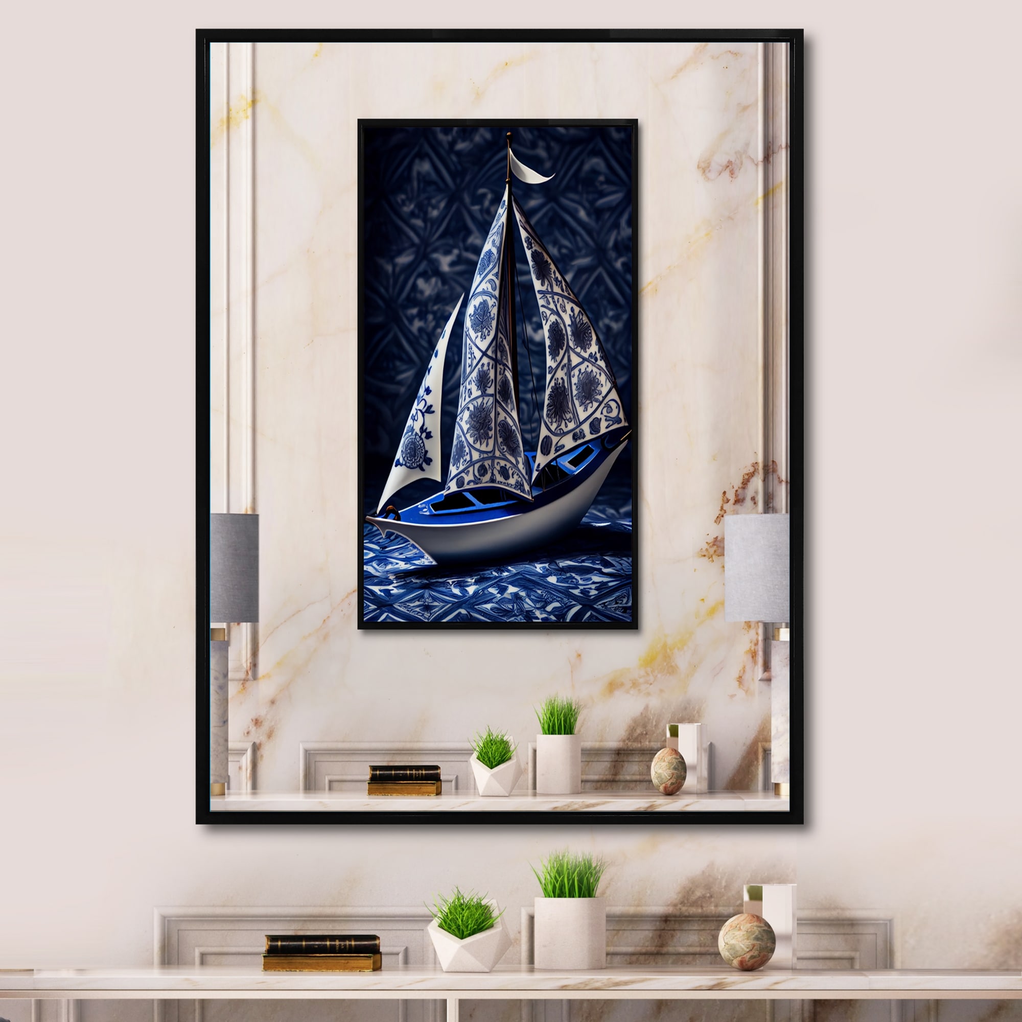 Designart "White And Blue Porcelain Sailboat" Coastal Boat Framed Canvas Wall Art Print