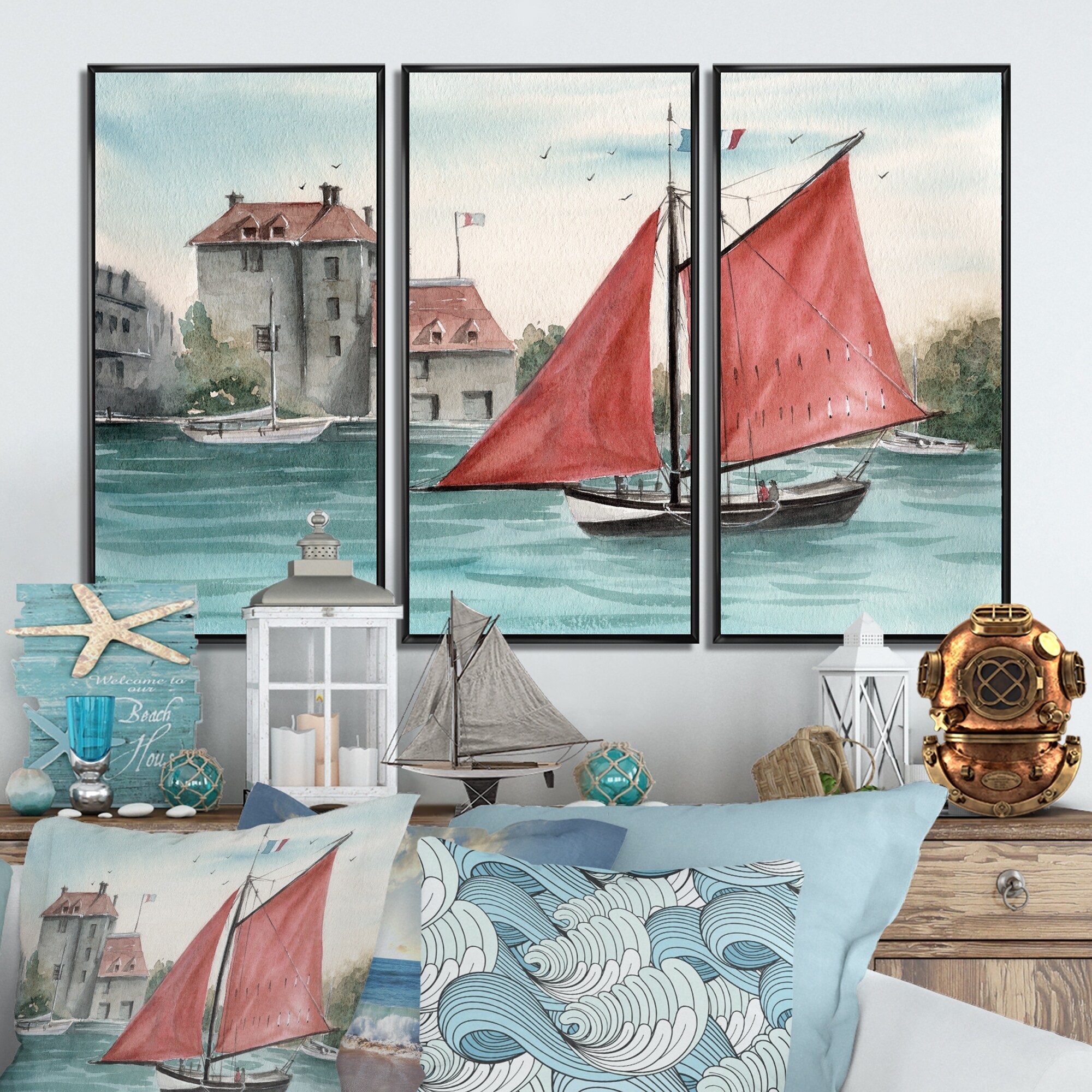 Designart "Landscape Of City Embankment With A Sailboat" Nautical & Coastal Framed Wall Art Set of 3 - 4 Colors of Frames