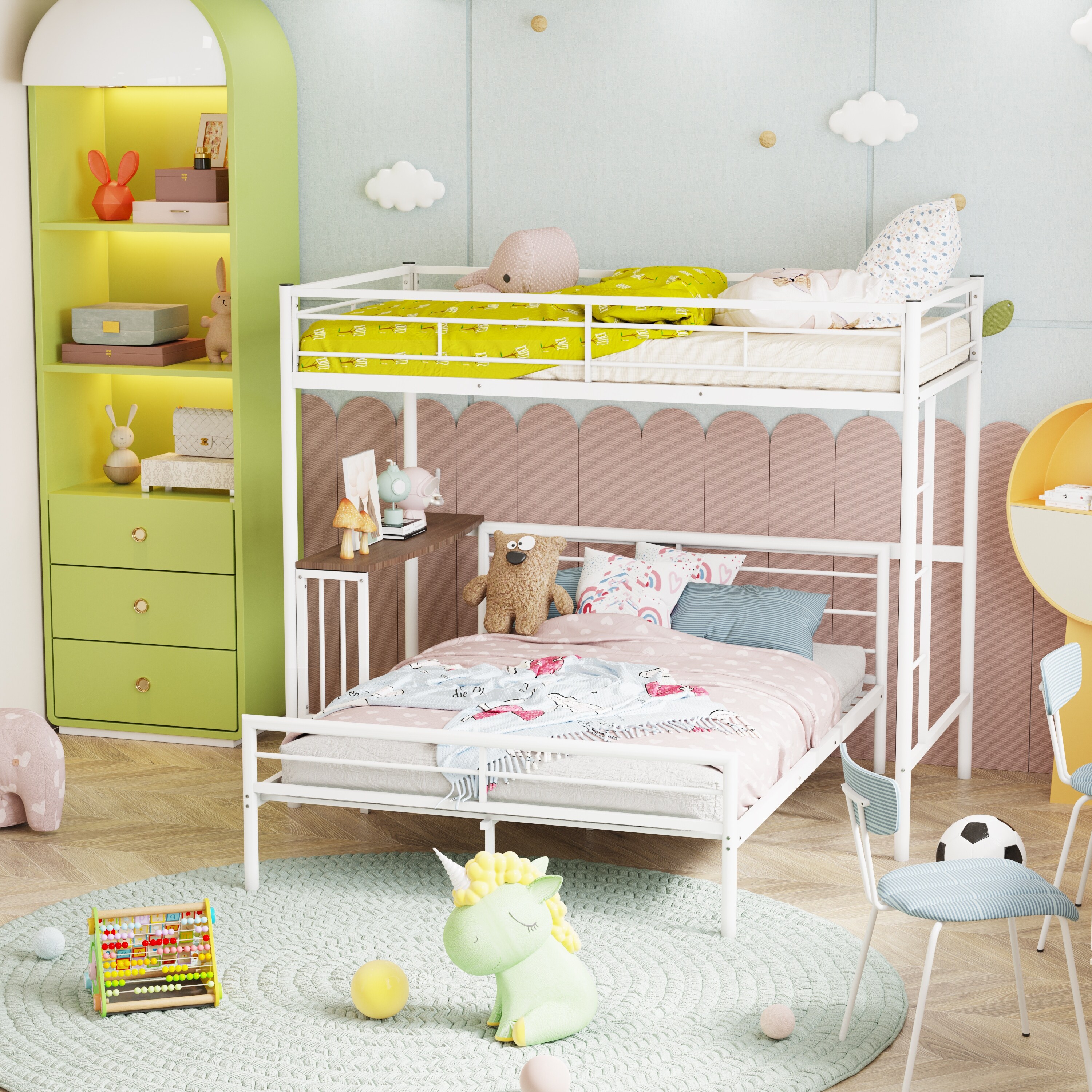 Twin Over Full Metal Bunk Bed with Desk, Ladder and Quality Slats for Bedroom, Metallic White
