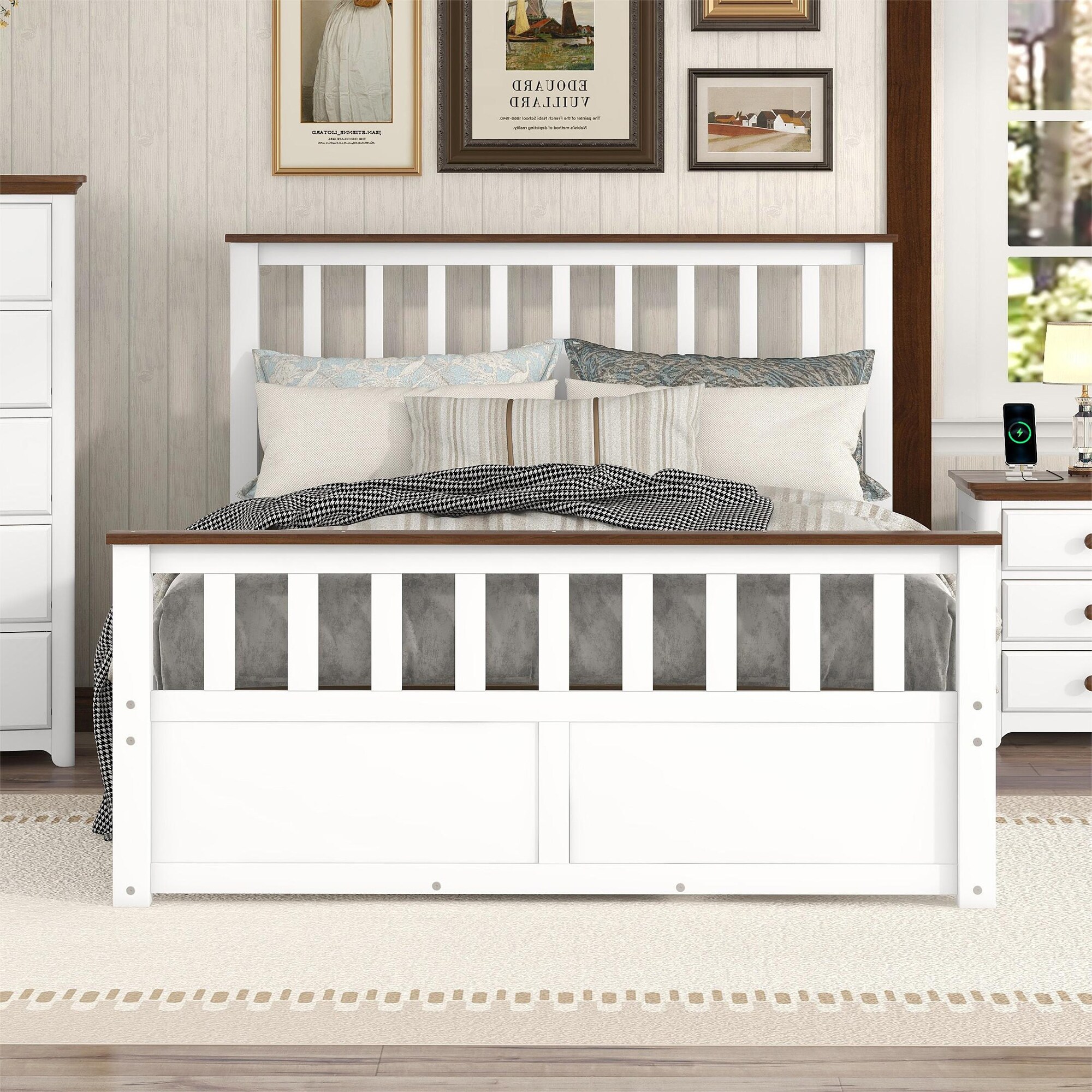 White and Walnut Wooden Platform Bed with Two Drawers and Wooden Slat Support