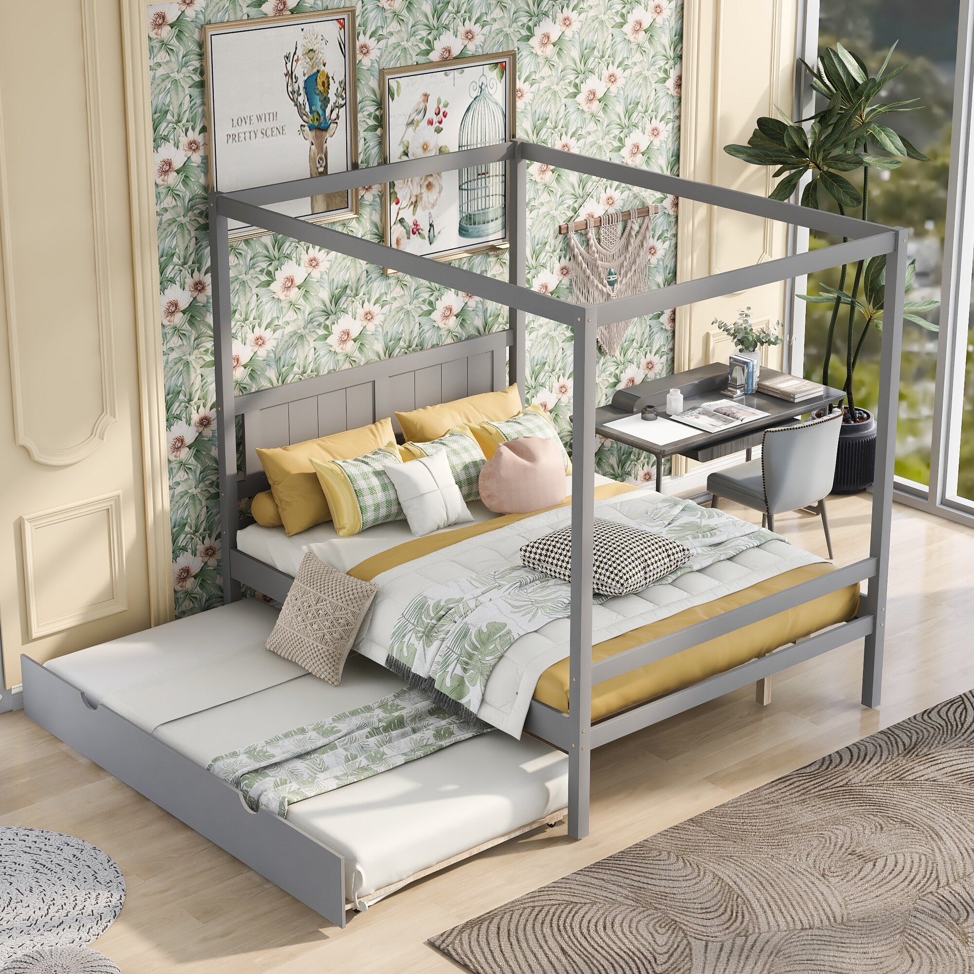 Wood Canopy Bed with Trundle Bed ,Full Size Canopy Platform bed With  Support Slats