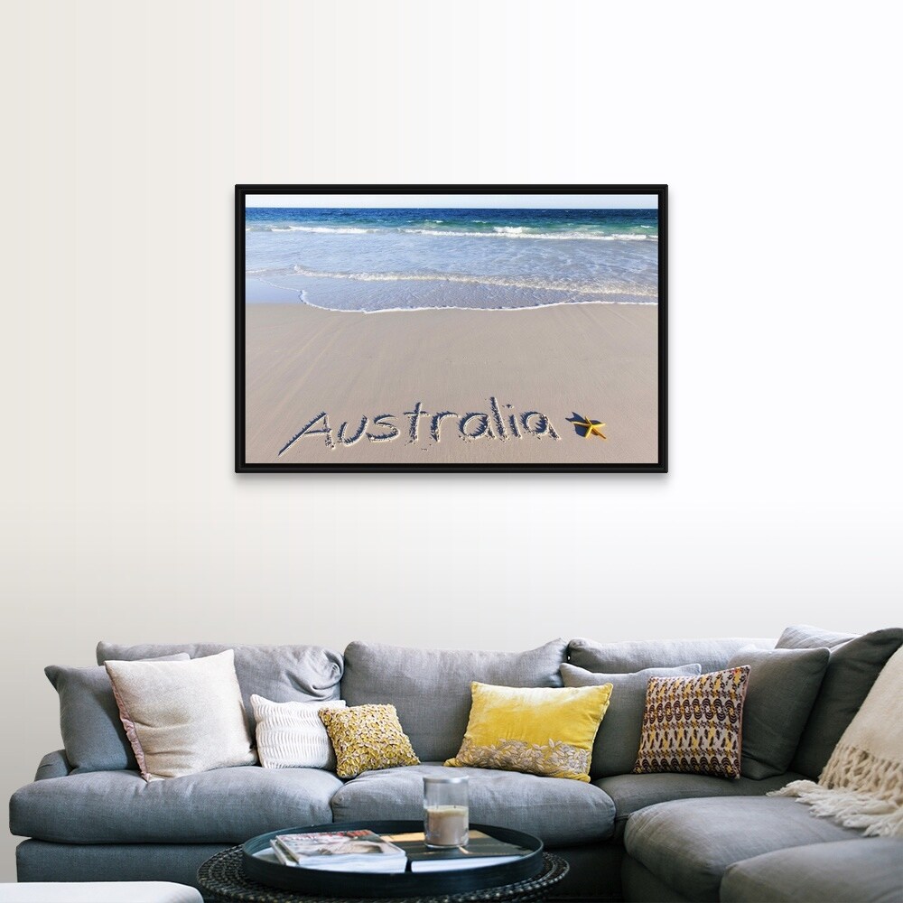 "Australia written on a sandy beach with a yellow starfish" Black Float Frame Canvas Art