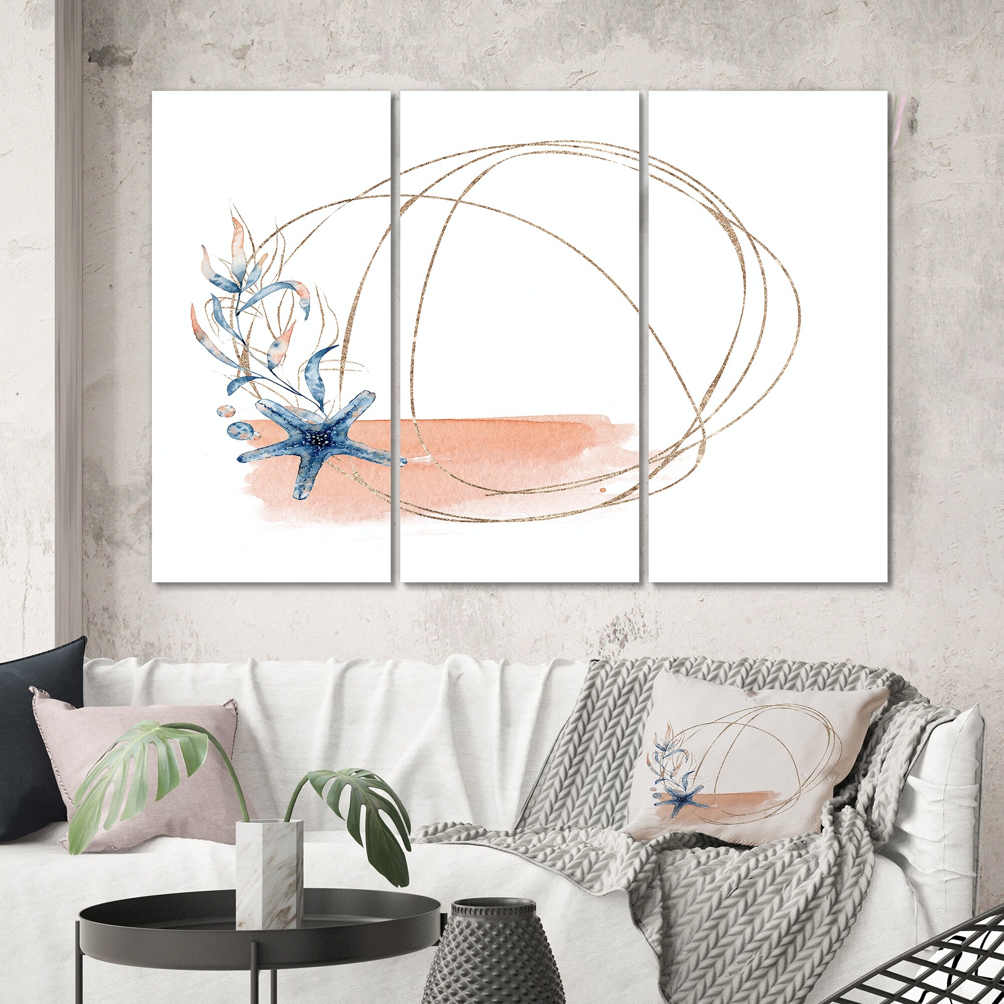 Designart "Golden Frame With Starfish" Nautical & Coastal Framed Canvas Wall Art Print Set of 3 - 4 Colors of Frames
