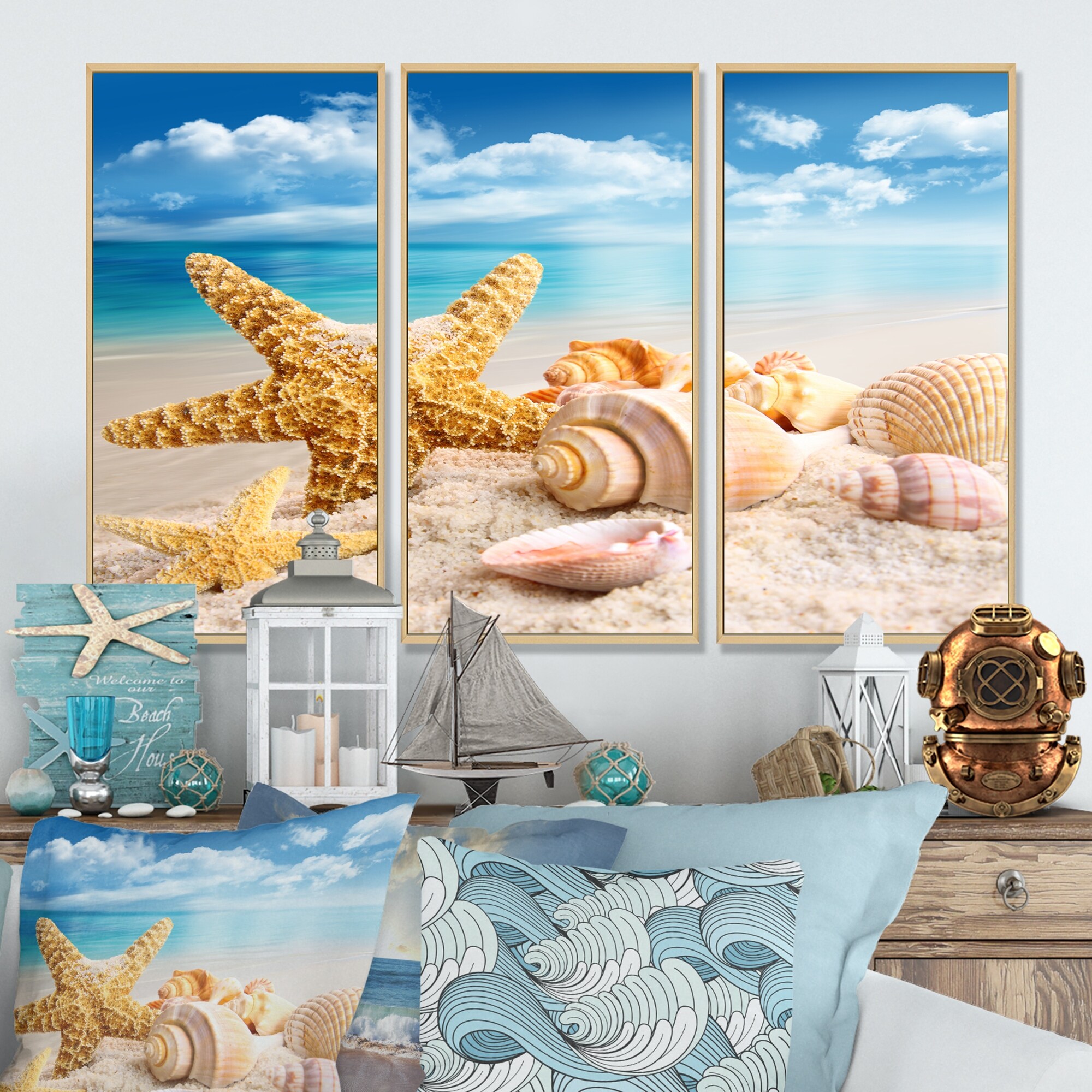 Designart "Starfish and Seashells on Beach" Sea & Shore Framed Wall Art Set of 3 - 4 Colors of Frames