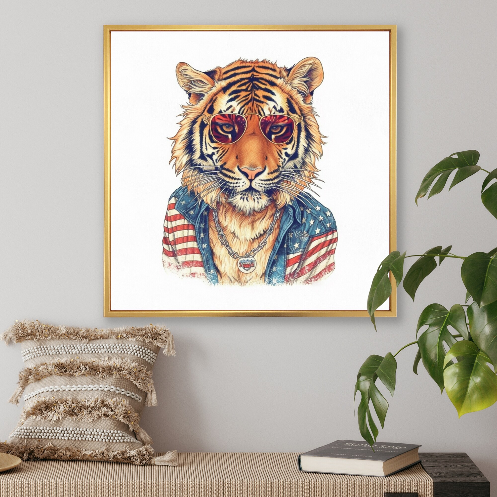 Designart "Orange Blue Tiger With Sunglasses" Animals Tiger Fashion Framed Wall Decor