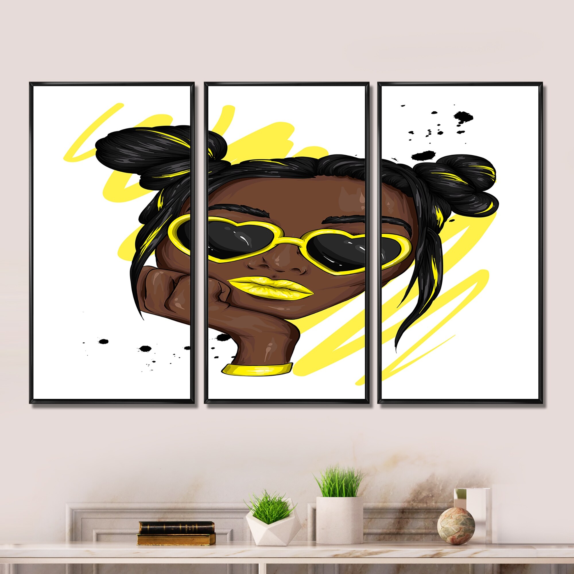 Designart "Girl With Yellow Heartshaped Sunglasses" Modern Framed Canvas Wall Art Print Set of 3 - 4 Colors of Frames