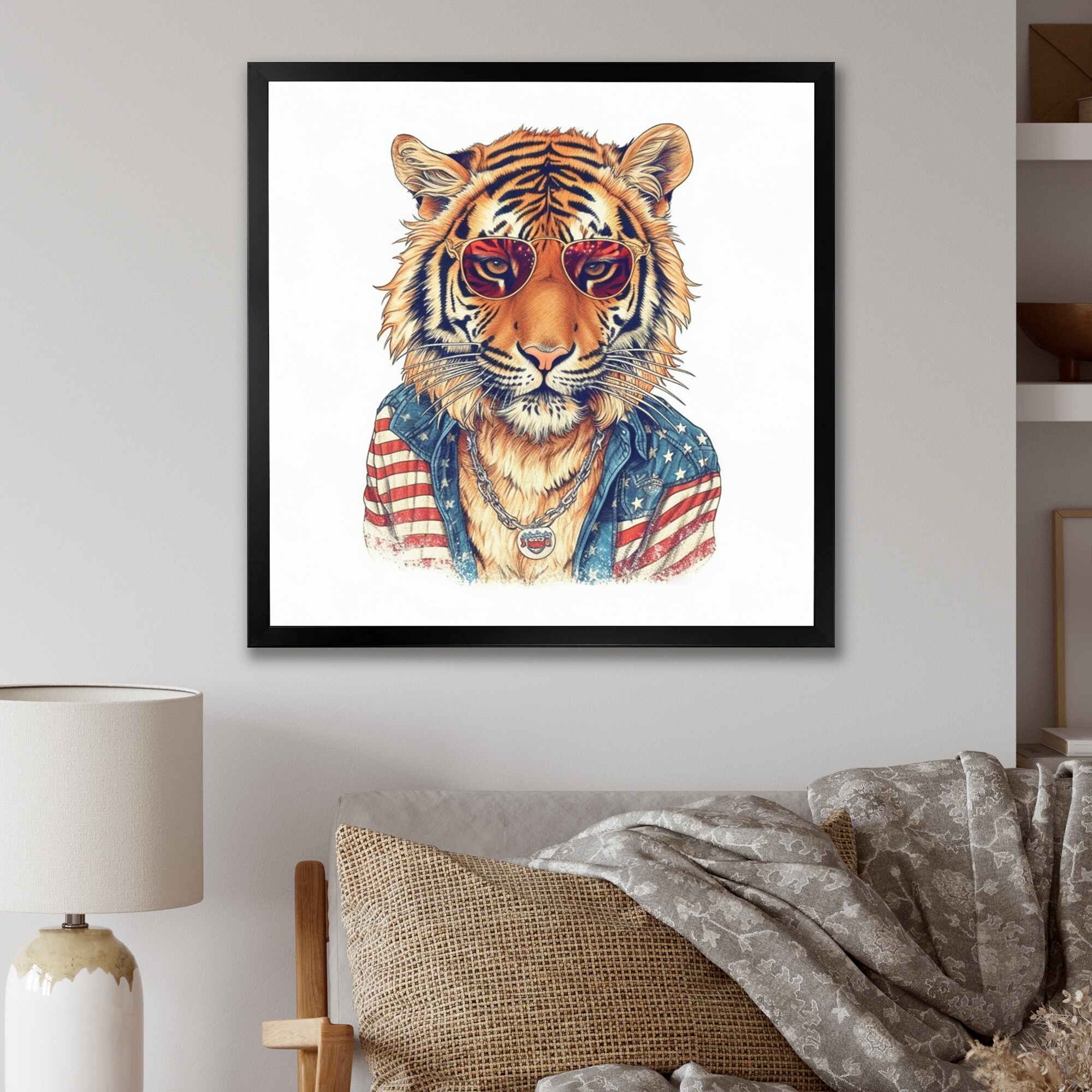 Designart "Orange Blue Tiger With Sunglasses" Animals Tiger Fashion Framed Wall Art Prints