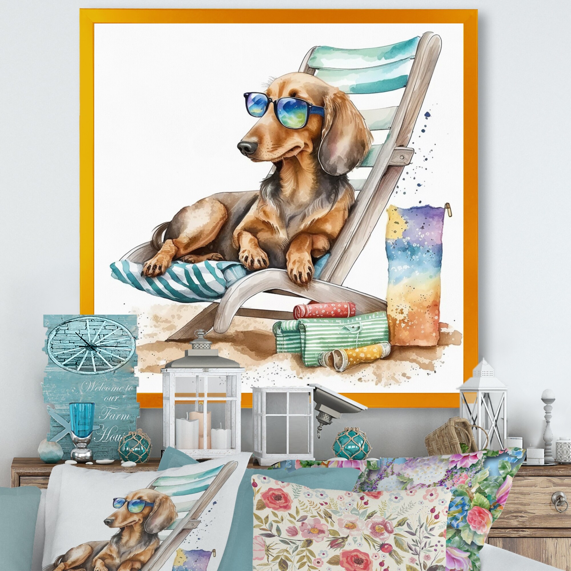 Designart "Dog Lounging on the Beach With Sunglasses IV" Animals Framed Art Print