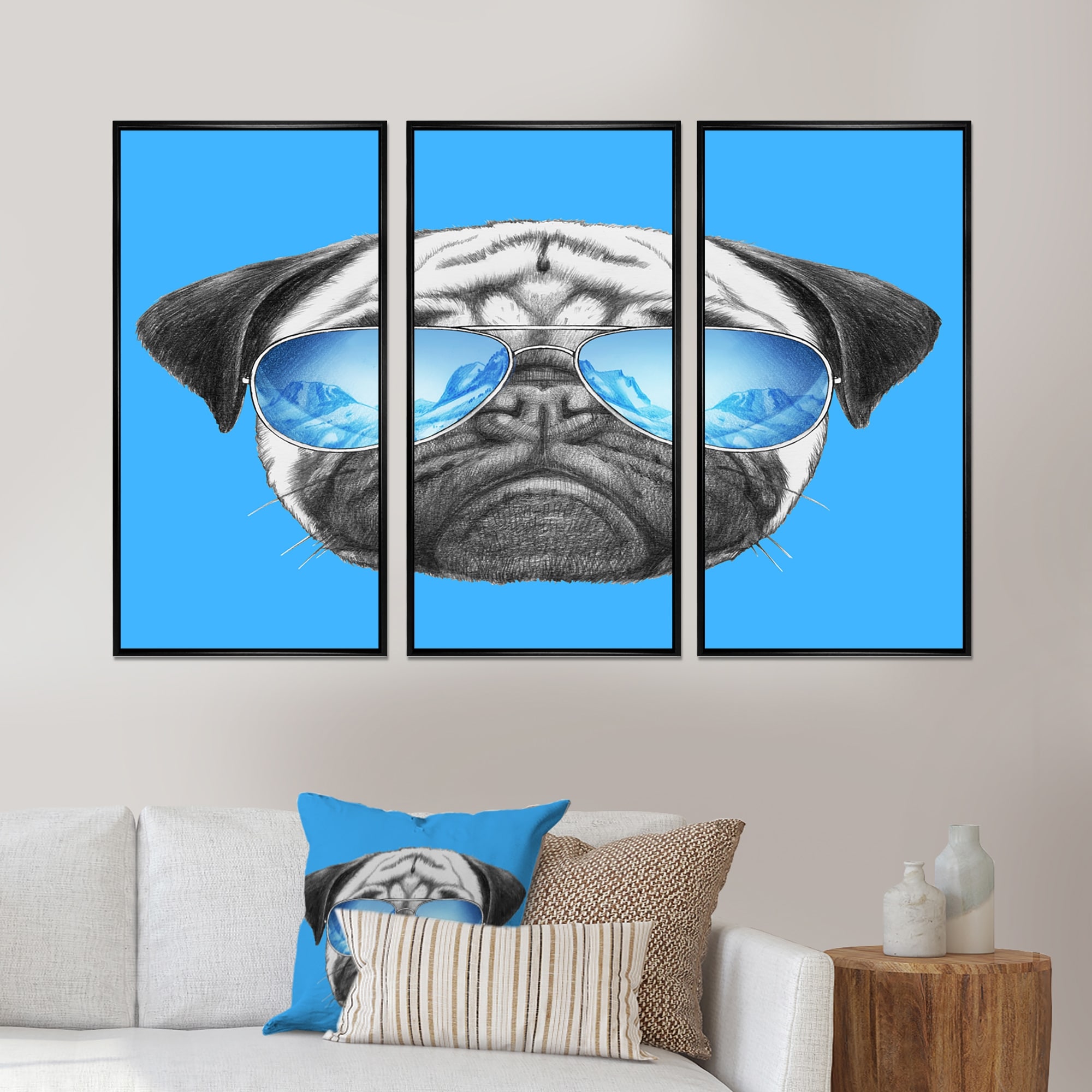 Designart "Pug Dog with Mirror Sunglasses" Animal Framed Canvas Wall Art Print Set of 3 - 4 Colors of Frames