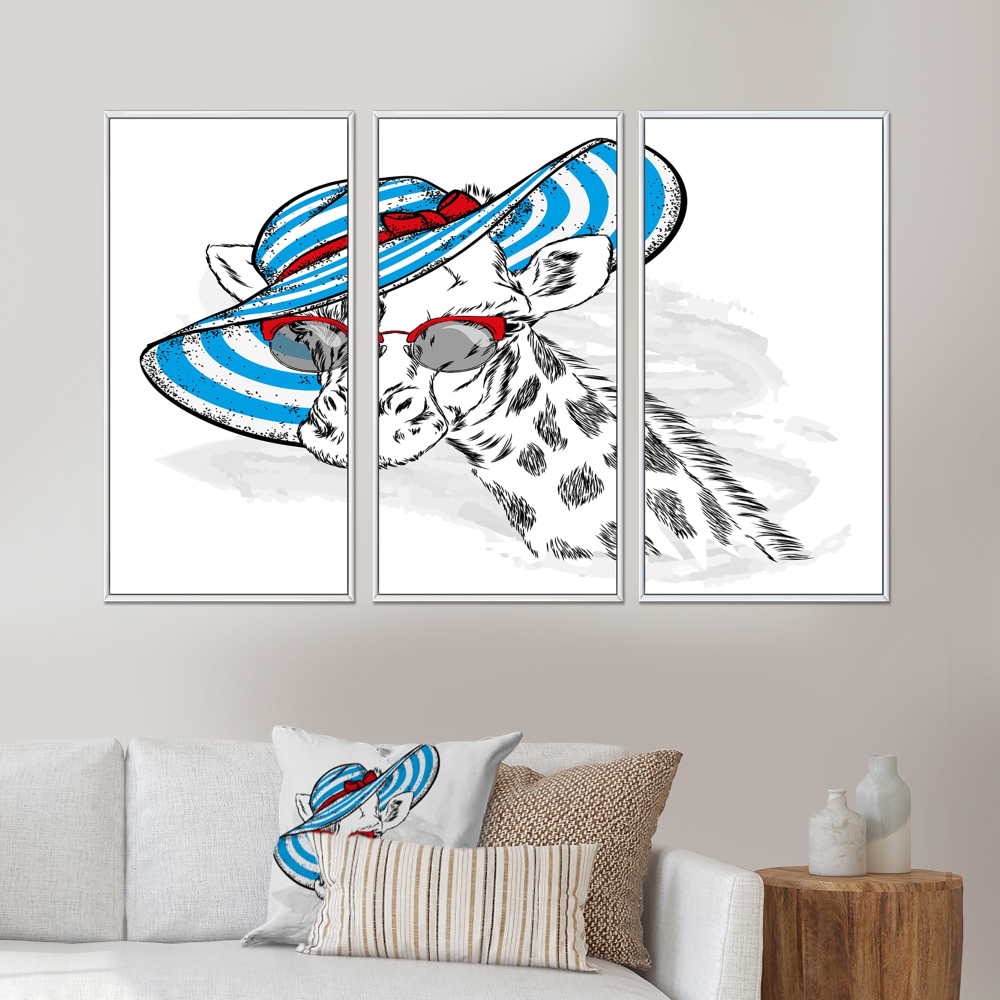 Designart "Giraffe With A Blue Hat And Red Sunglasses" Children's Art Framed Art Prints Set of 3 - 4 Colors of Frames