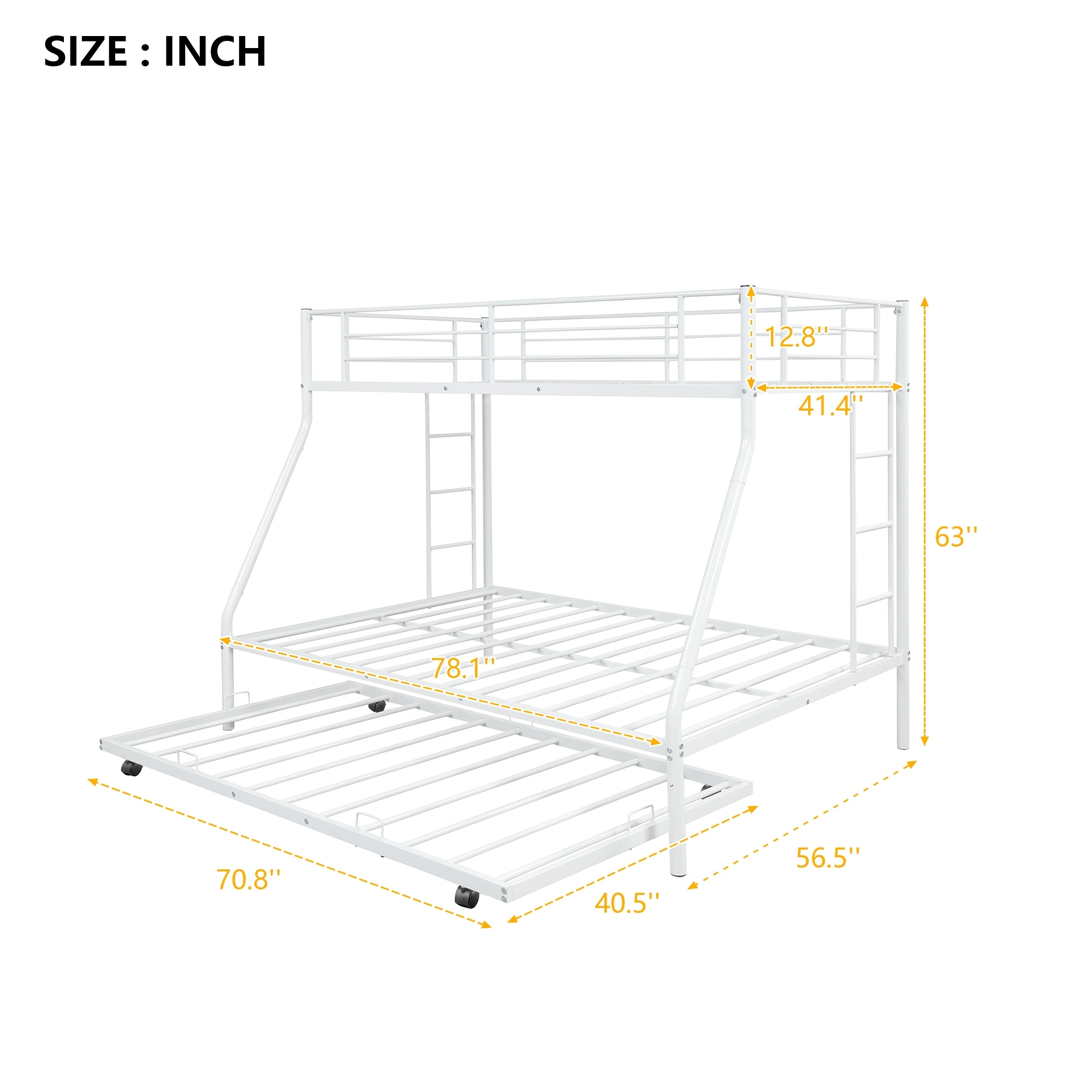 Twin over Full Bed with Sturdy Steel Frame, Bunk Bed with Twin Size Trundle, Two-Side Ladders, White