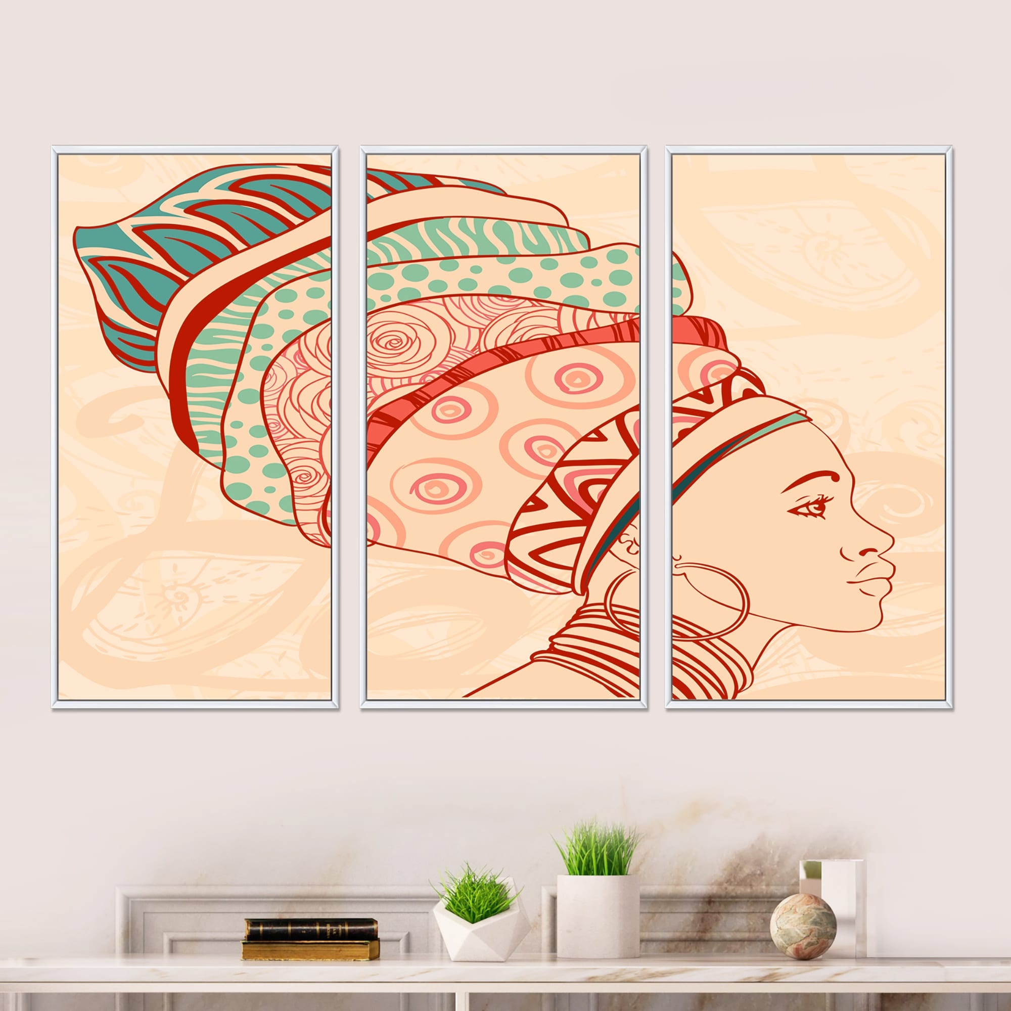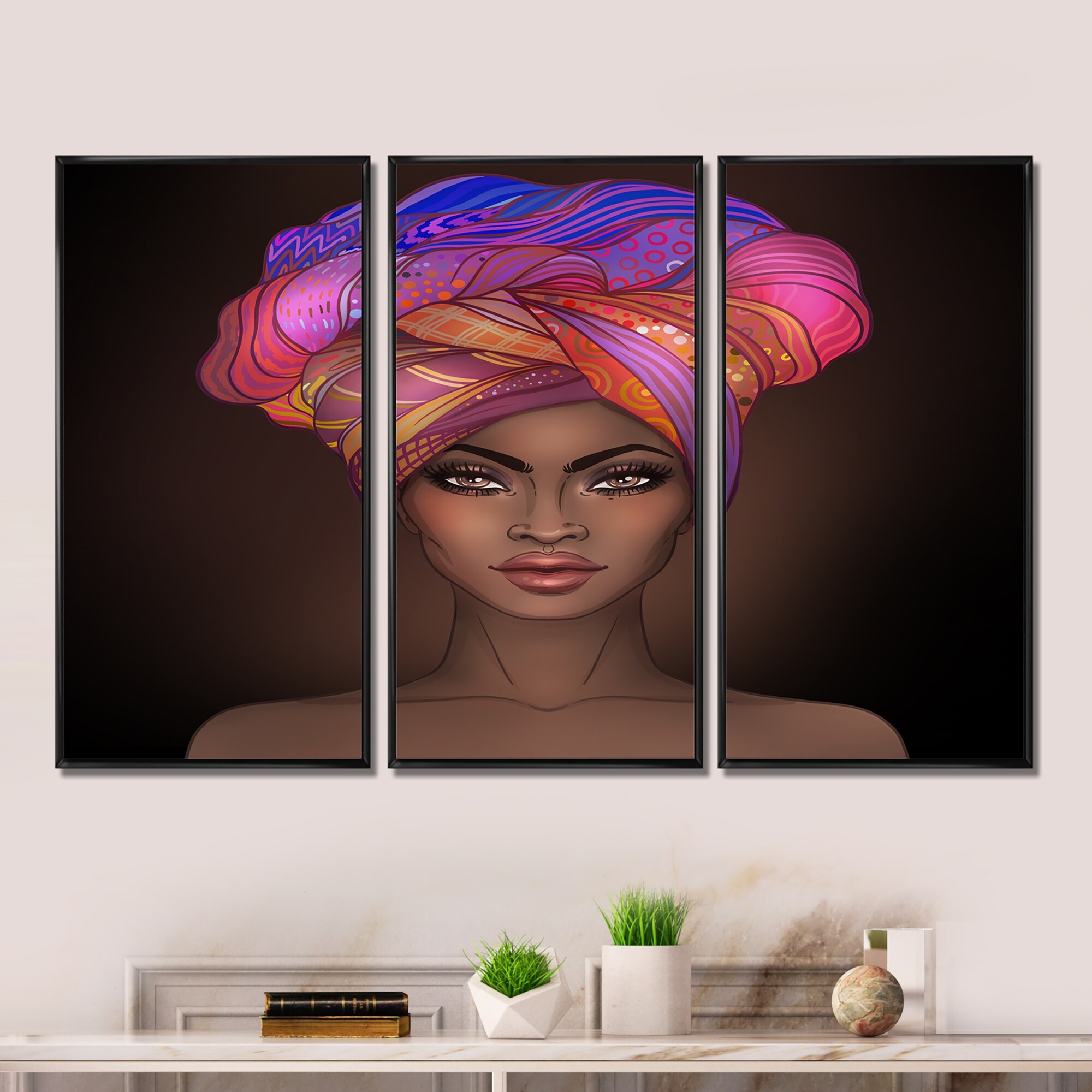 Designart "African American Woman with Turban VI" Modern Framed Canvas Wall Art Set of 3 - 4 Colors of Frames