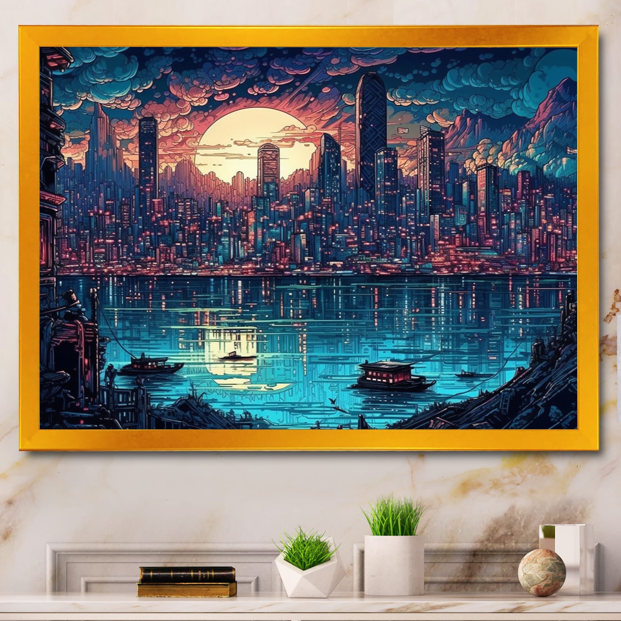 Designart "Orange And Blue Electrifying Skylines" City Art Deco Framed Wall Art for Living Room