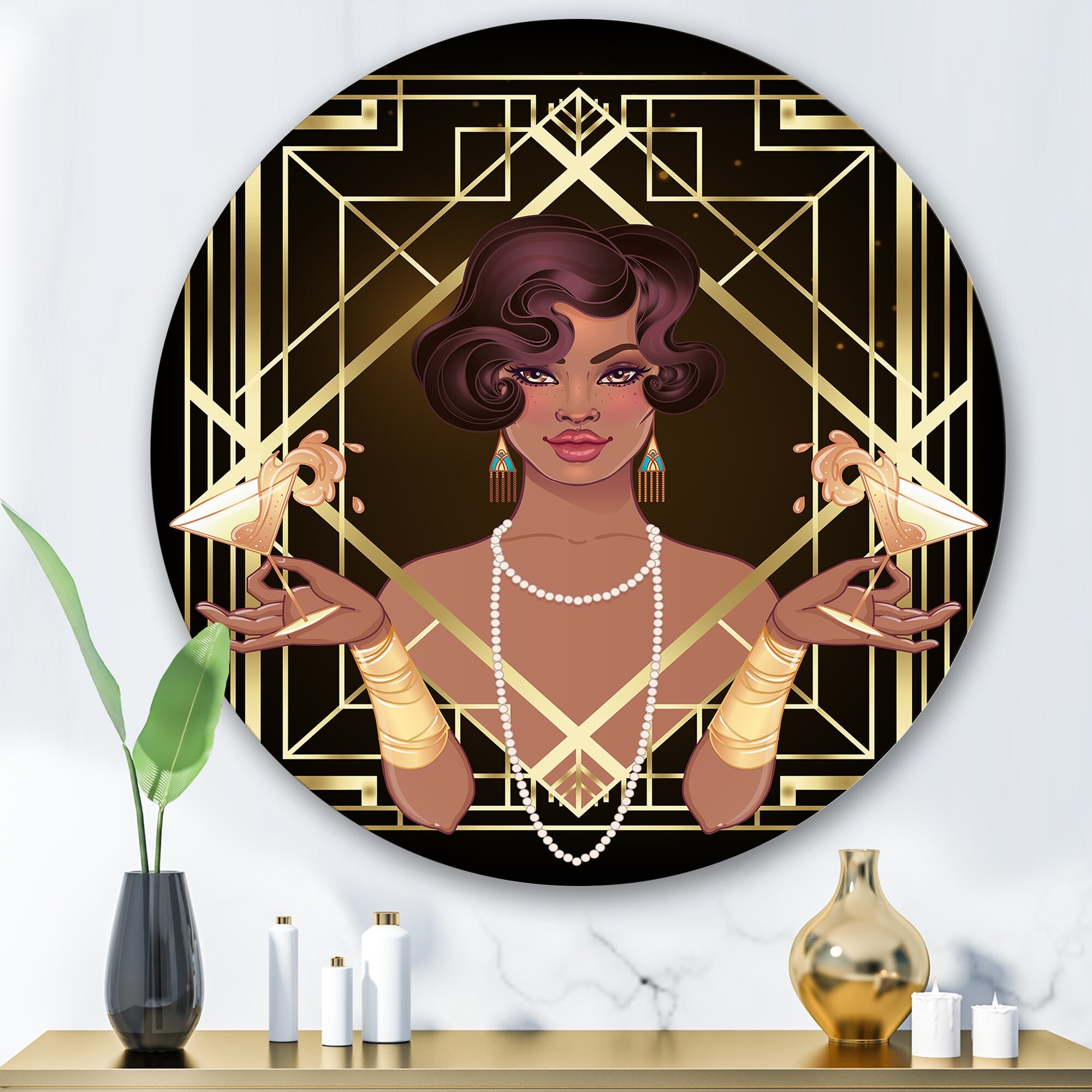Designart 'Retro Women in Golden Art Deco Geometrics I' Modern Metal Circle Wall Art