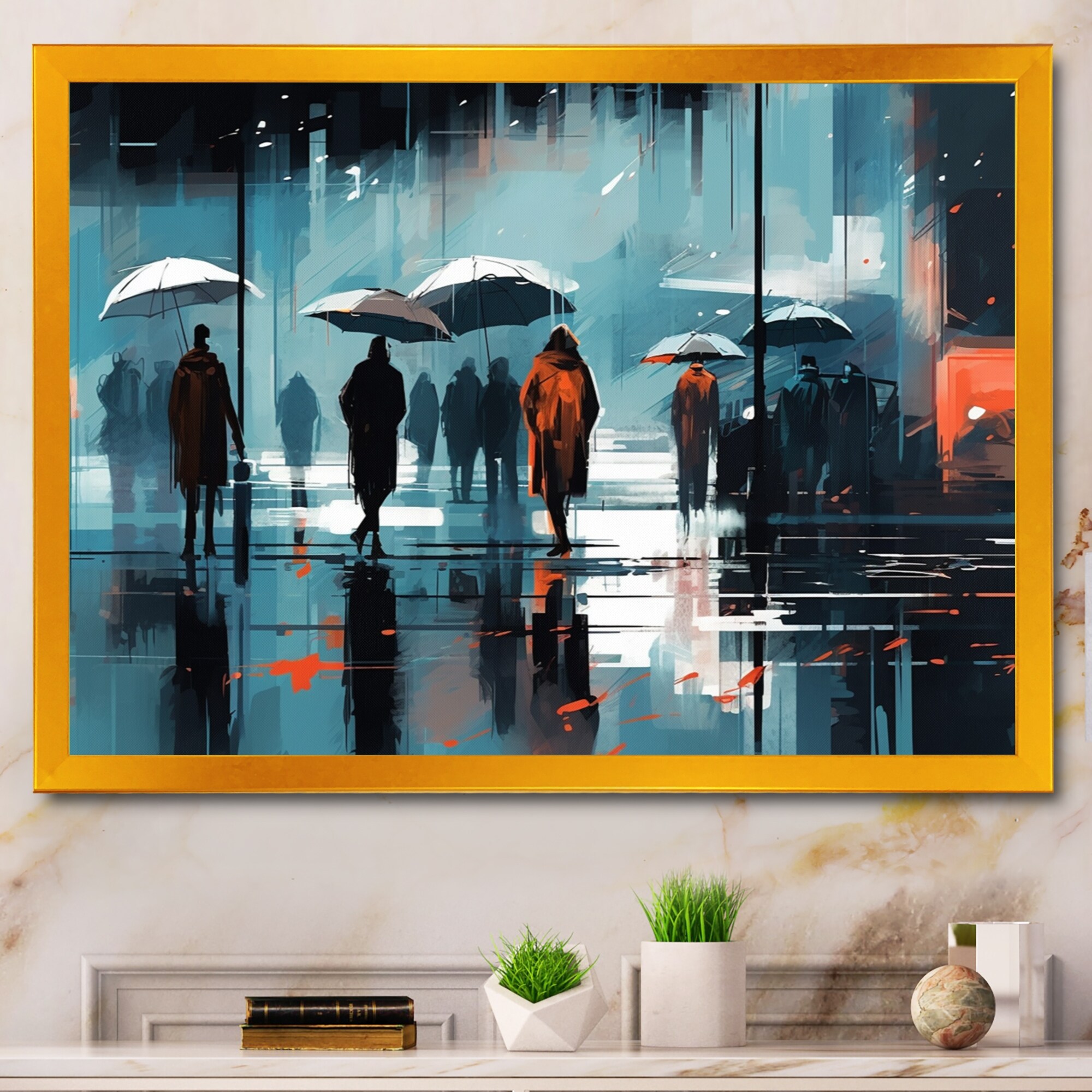 Designart "Blue And Orange Reflections of a Rainy Day" City Art Deco Framed Wall Art Prints