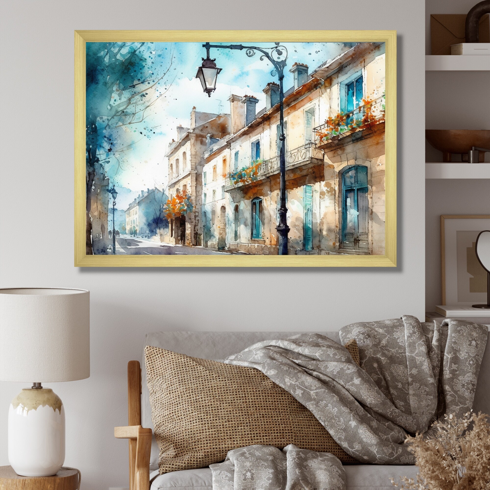 Designart "Blue And Beige French Small Town" City Art Deco Framed Wall Art for Living Room