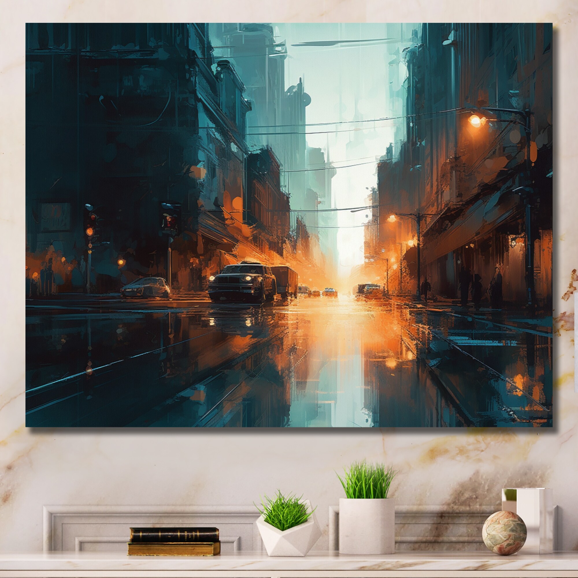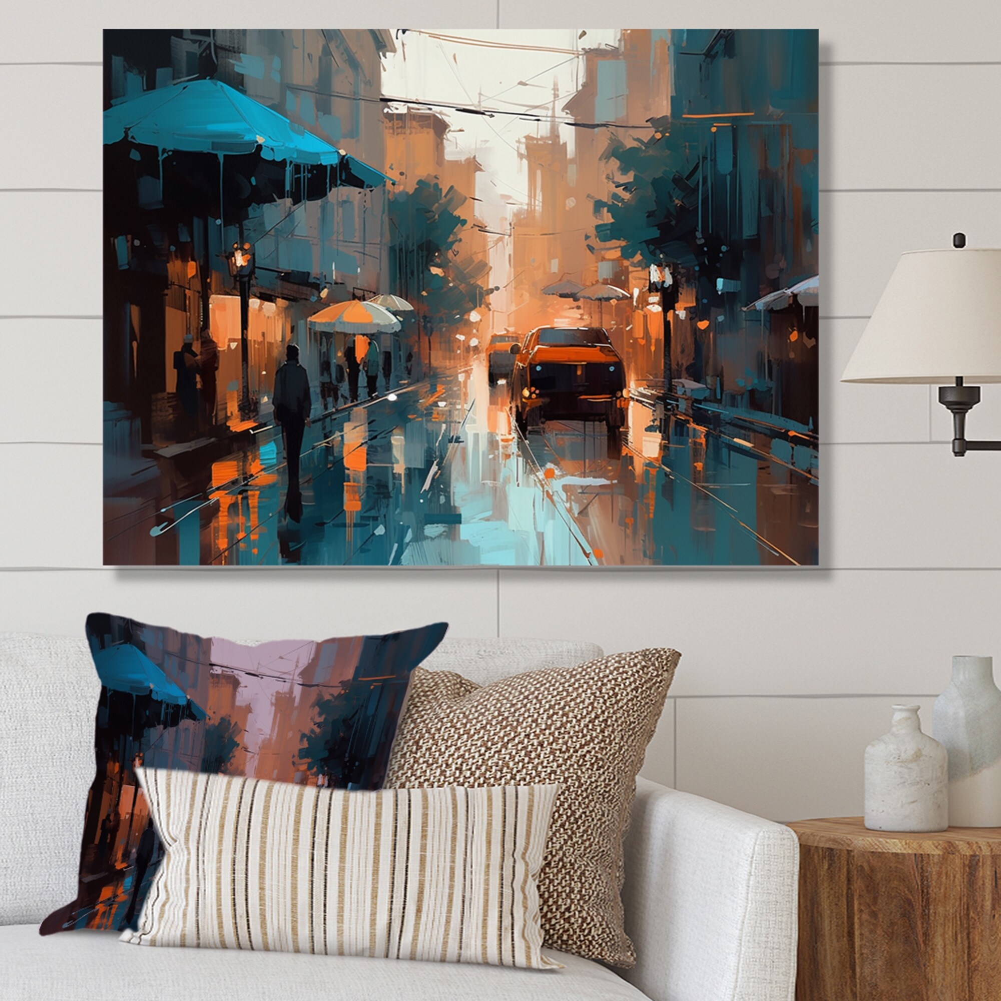 Designart "Blue And Orange Capturing the Beauty of a Rainy Day I" City Art Deco Canvas Wall Art
