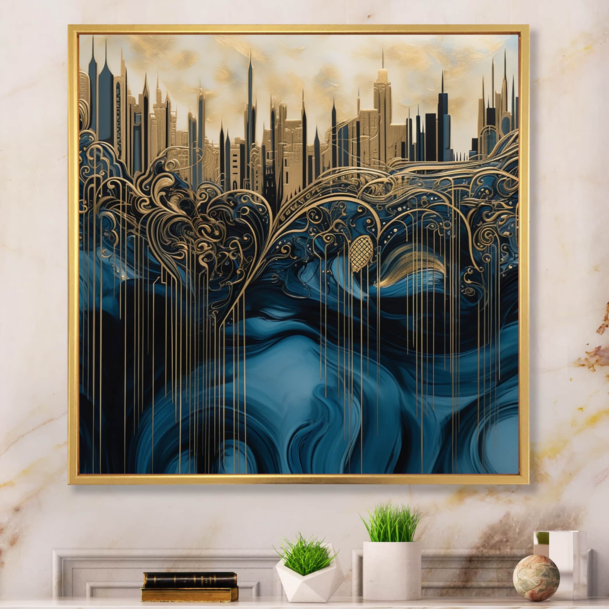 Designart "Gold And Blue Urban Elegance I" City Art Deco Framed Canvas Wall Art