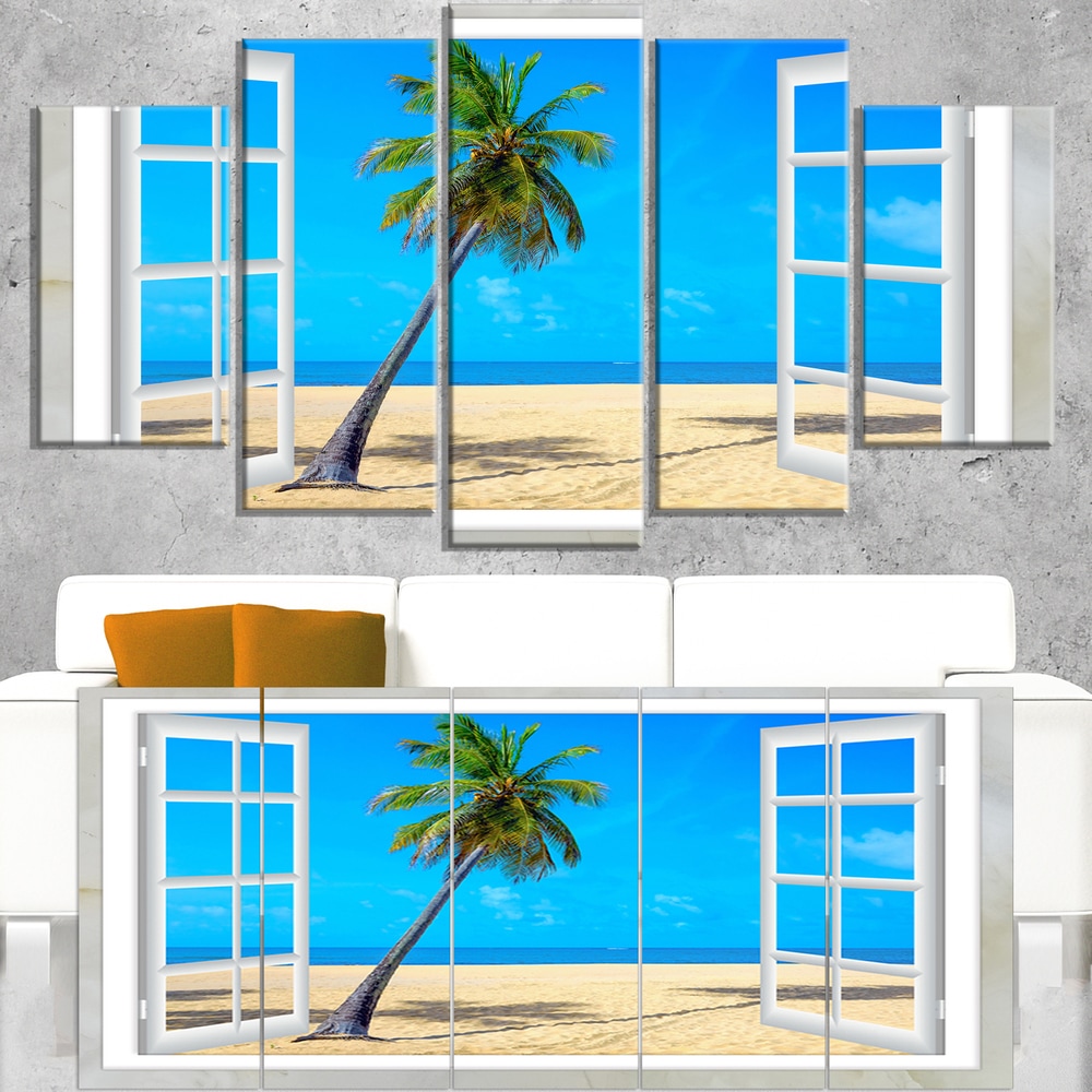 Designart "Window Open to Beach with Palm" Extra Large Seashore Framed Canvas Art