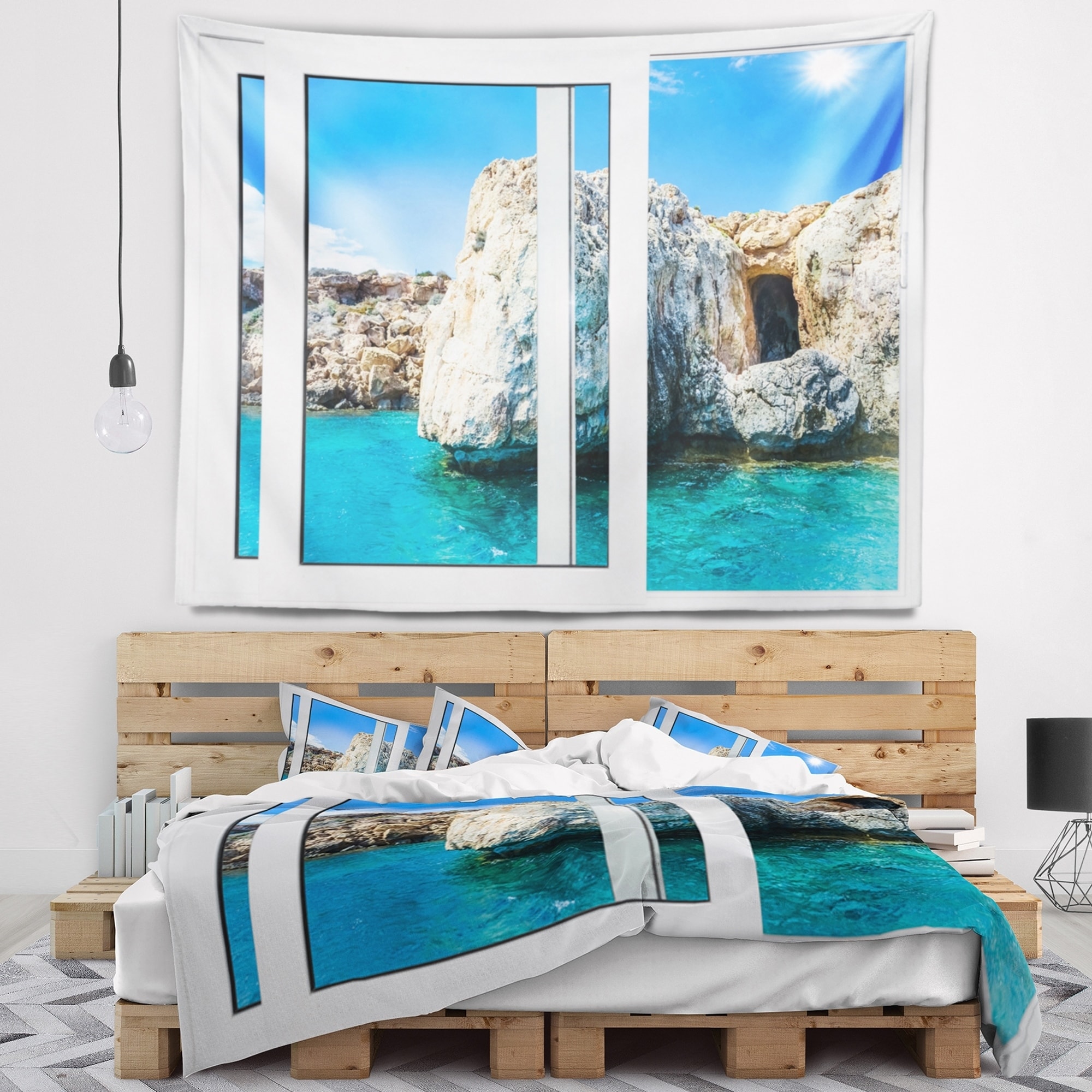Designart 'Open Window to Rocky Sunny Ocean' Seashore Wall Tapestry