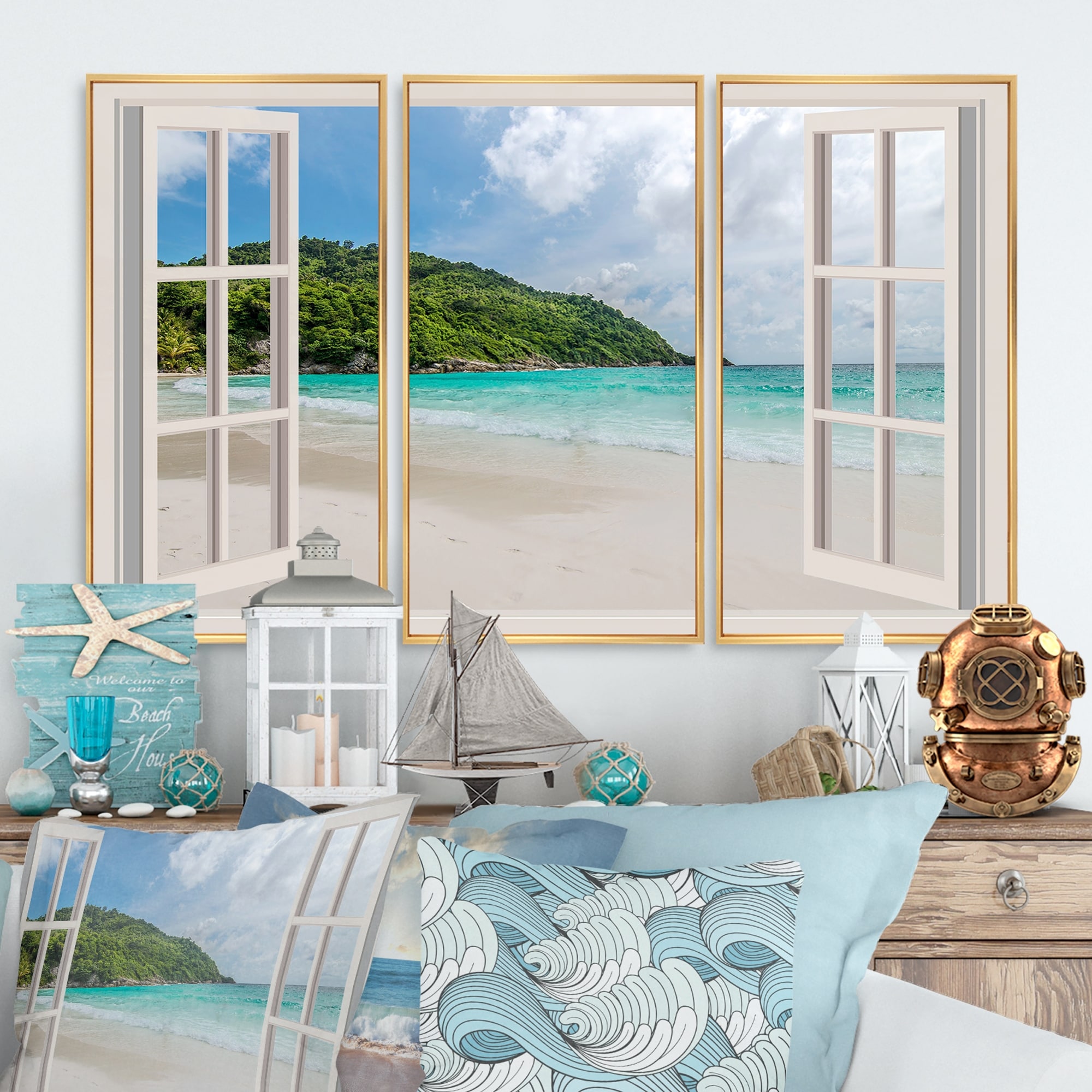 Designart "Open Window to Calm Seashore" Sea & Shore Framed Wall Decor Set of 3 - 4 Colors of Frames