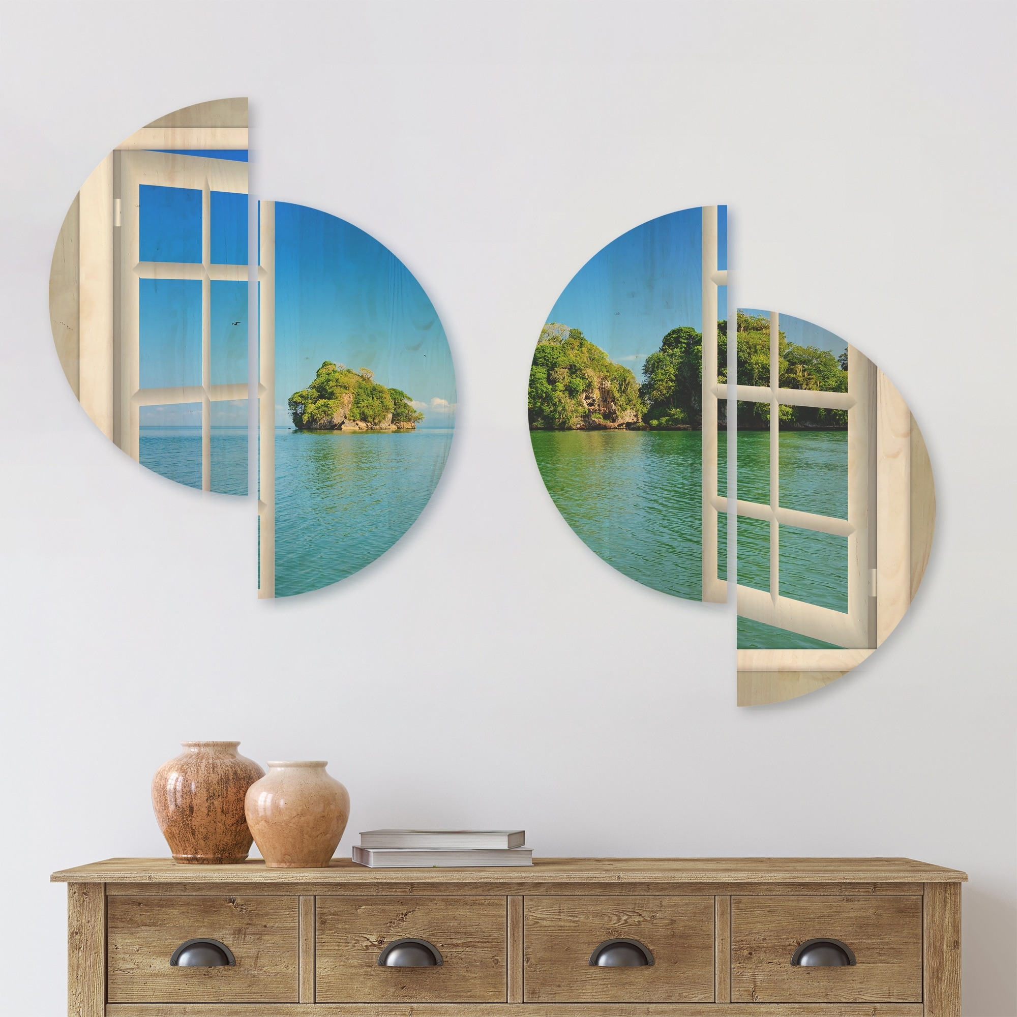 Designart 'Open Window to Ocean Islets' Landscape Wood Wall Art Set of 4 Half Circles