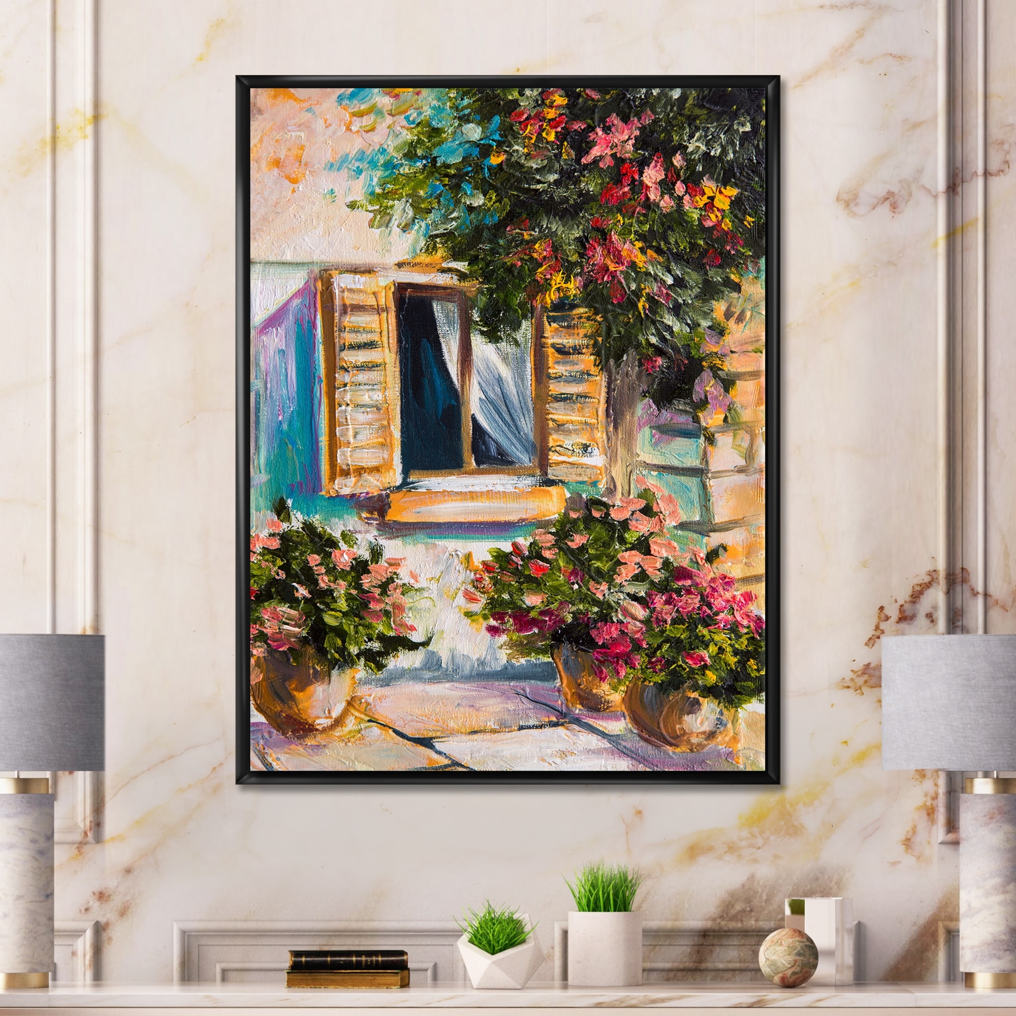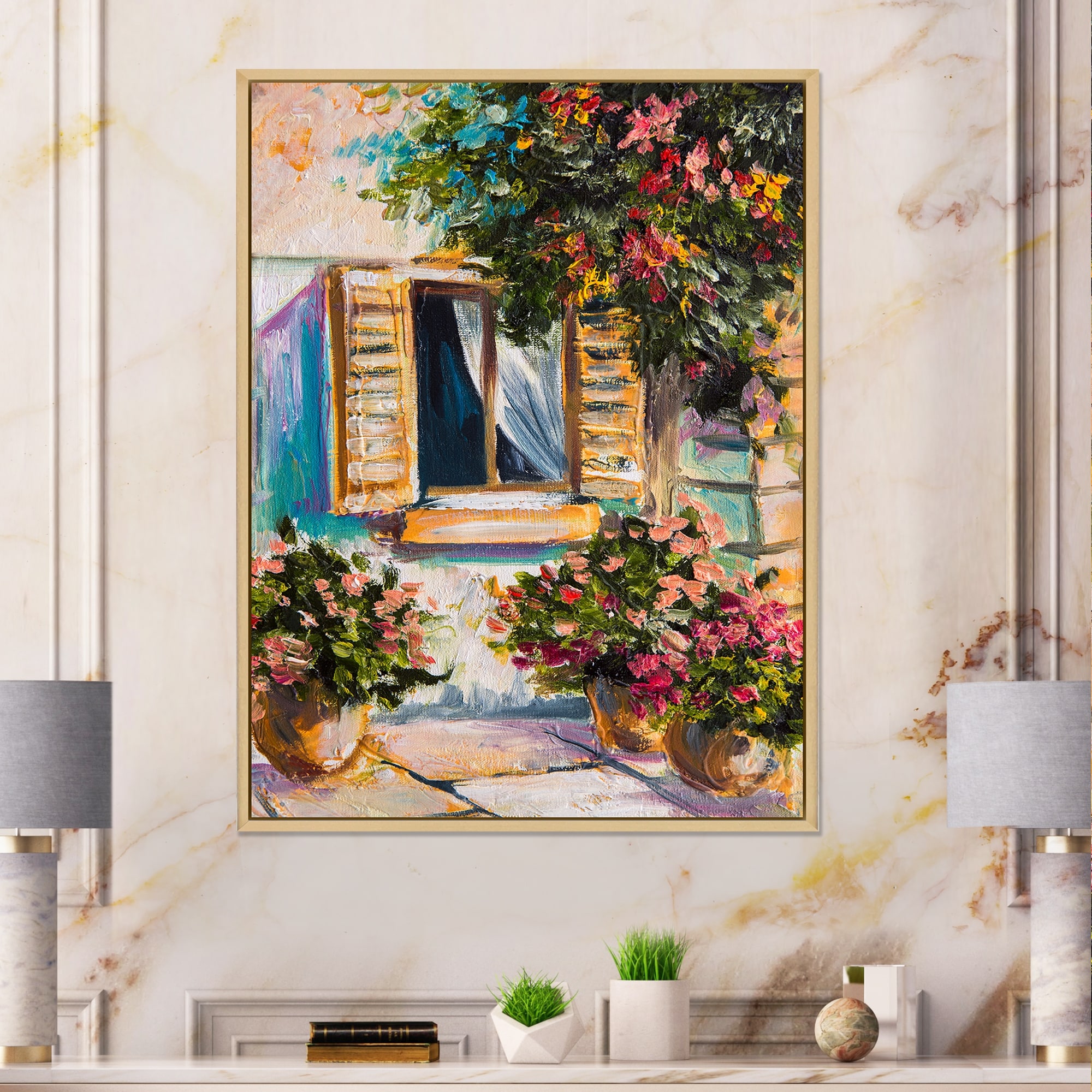 Designart "Open Window With Vibrant Flowers in Greek Street" Colonial Framed Canvas Wall Art Print