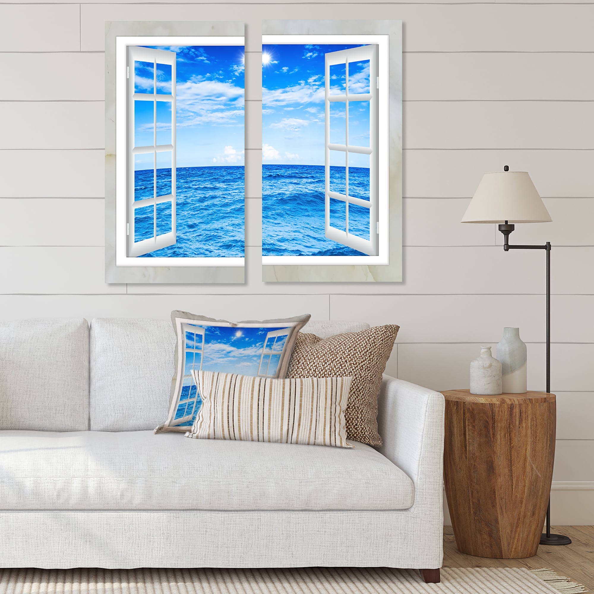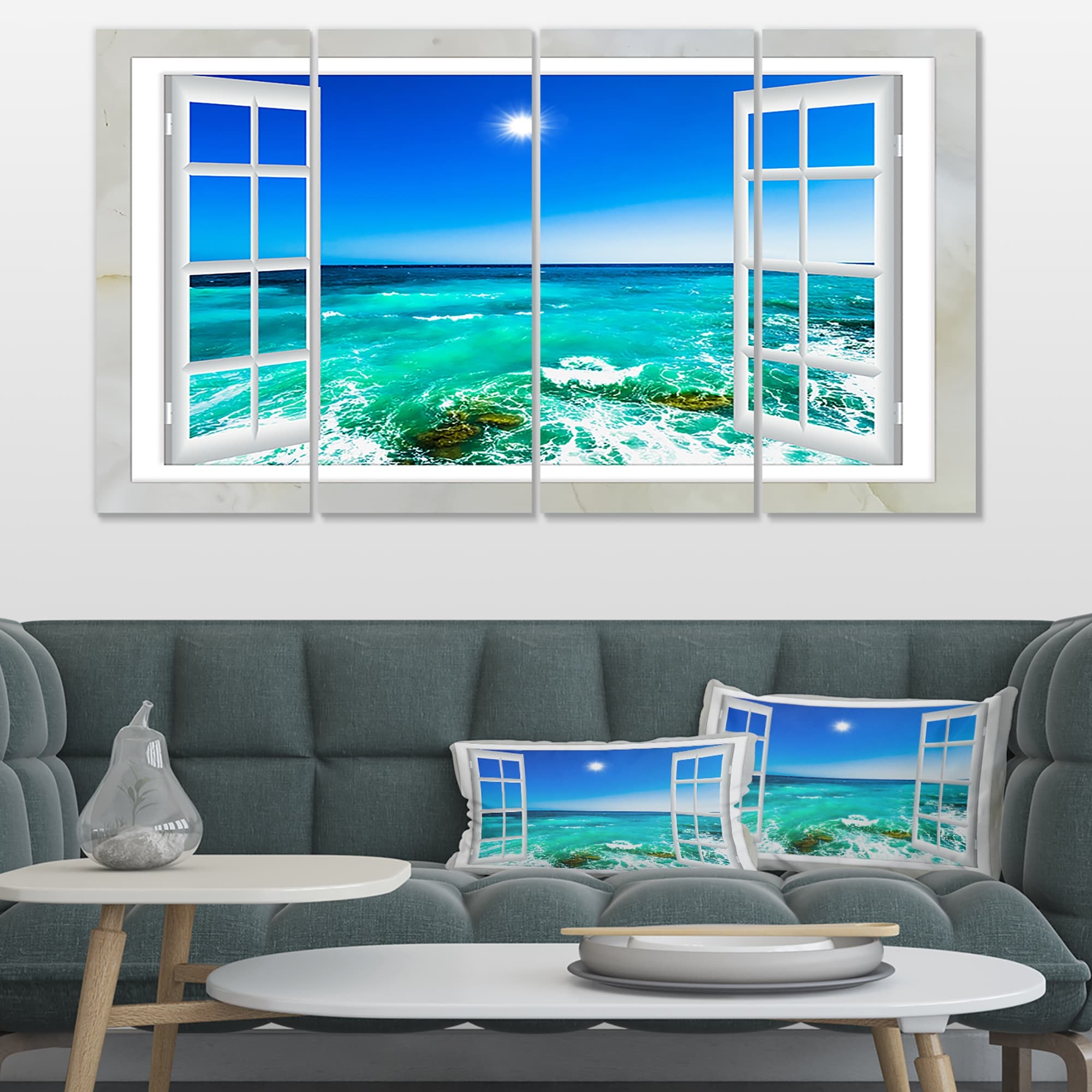 Designart "Window Open to Blue Wavy Ocean" Seashore Canvas Wall Art Print 2 Piece Set