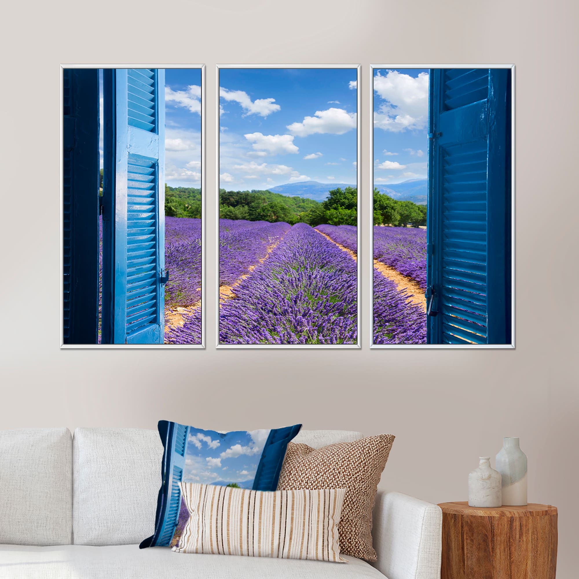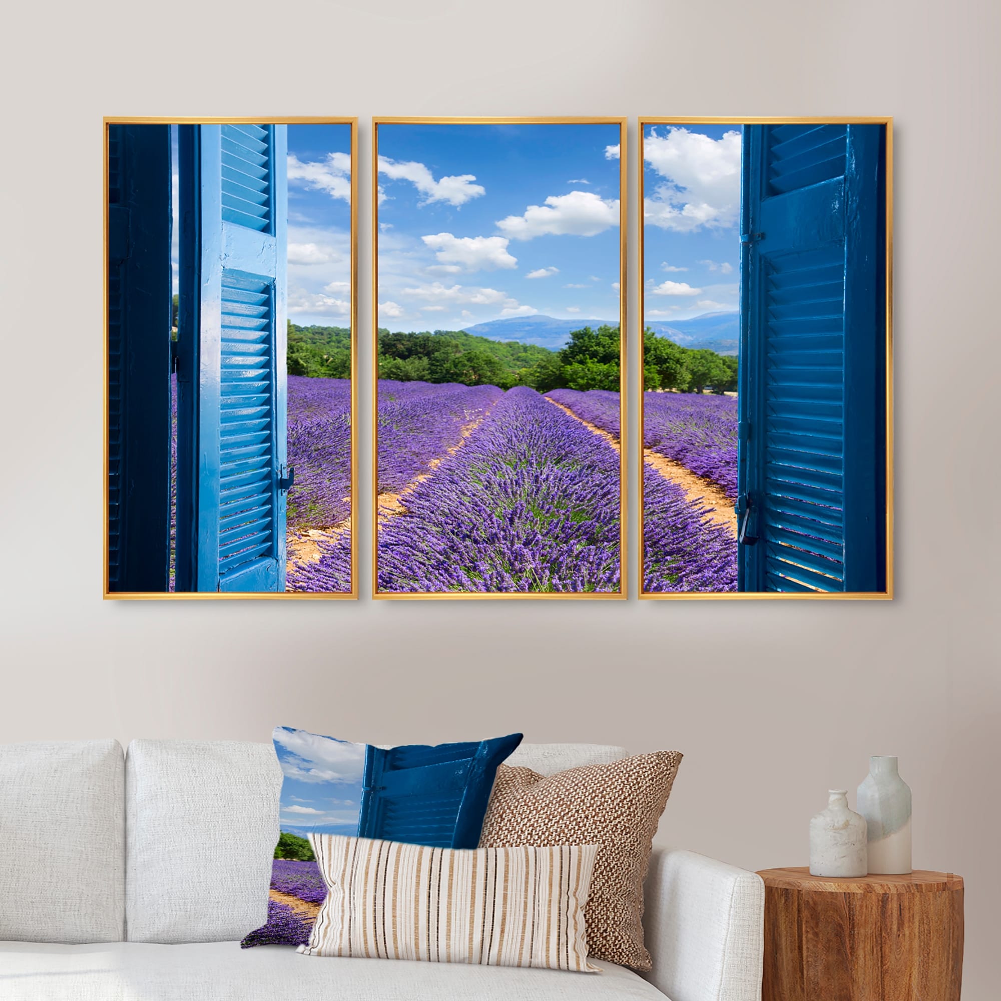 Designart "Lavender Field Through Blue Open Cottage Window" Farmhouse Framed Art Set of 3 - 4 Colors of Frames