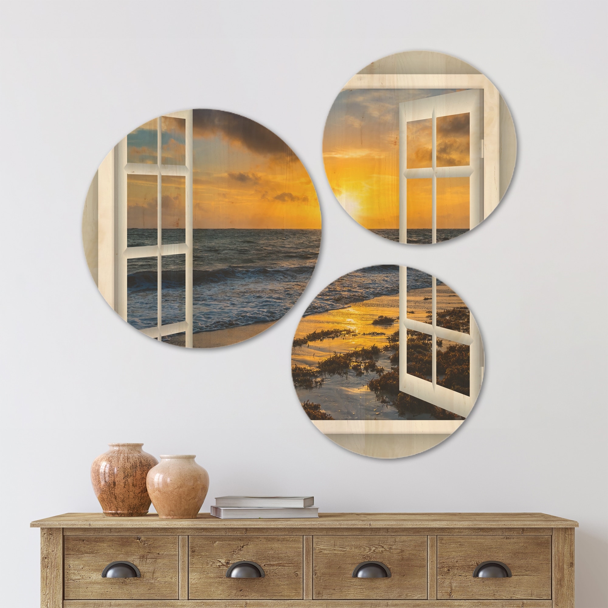 Designart 'Open Window to Bright Yellow Sunset' Modern Seascape Wood Wall Art Set of 3 Circles