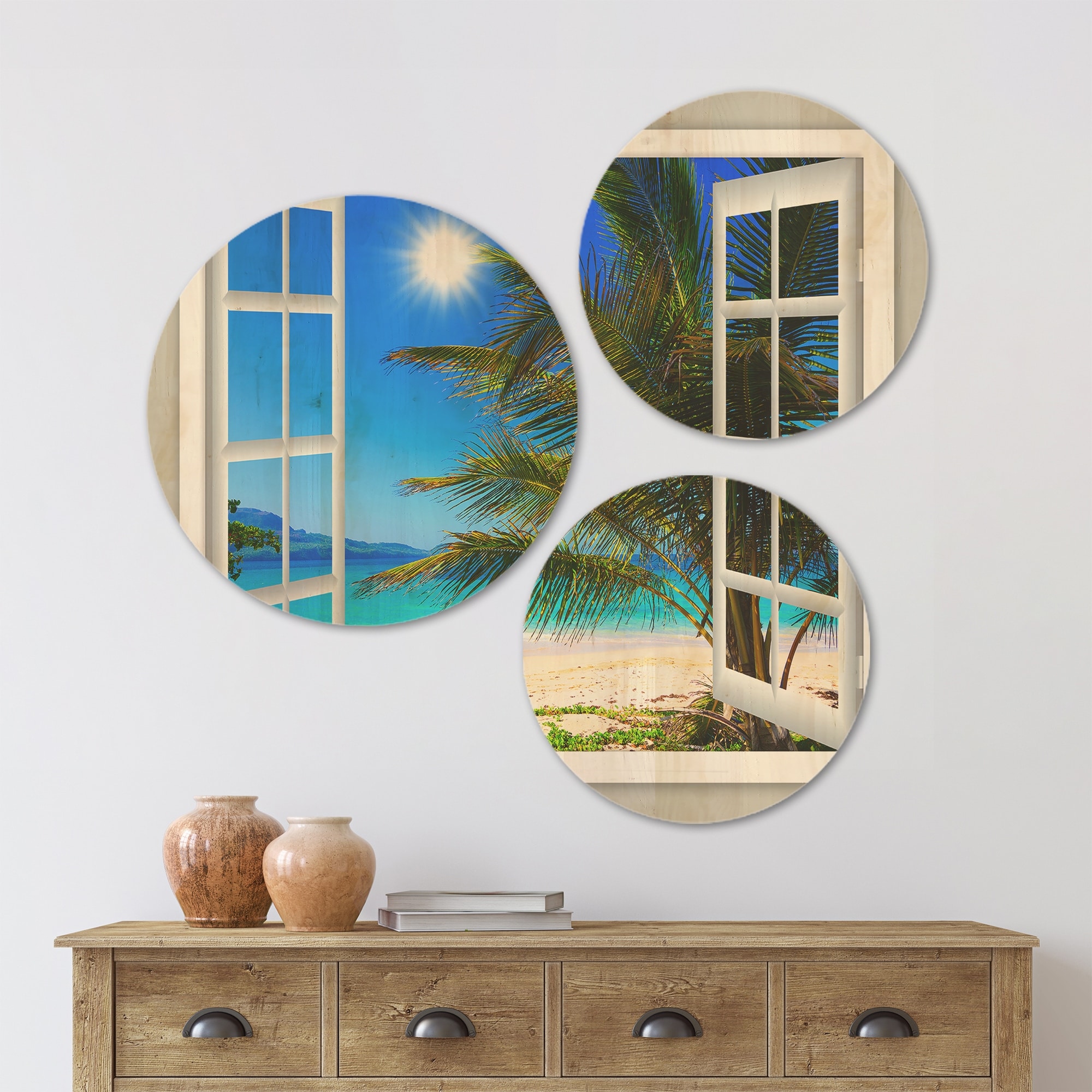 Designart 'Window Open to Beach with Palm' Seashore Wood Wall Art Set of 3 Circles