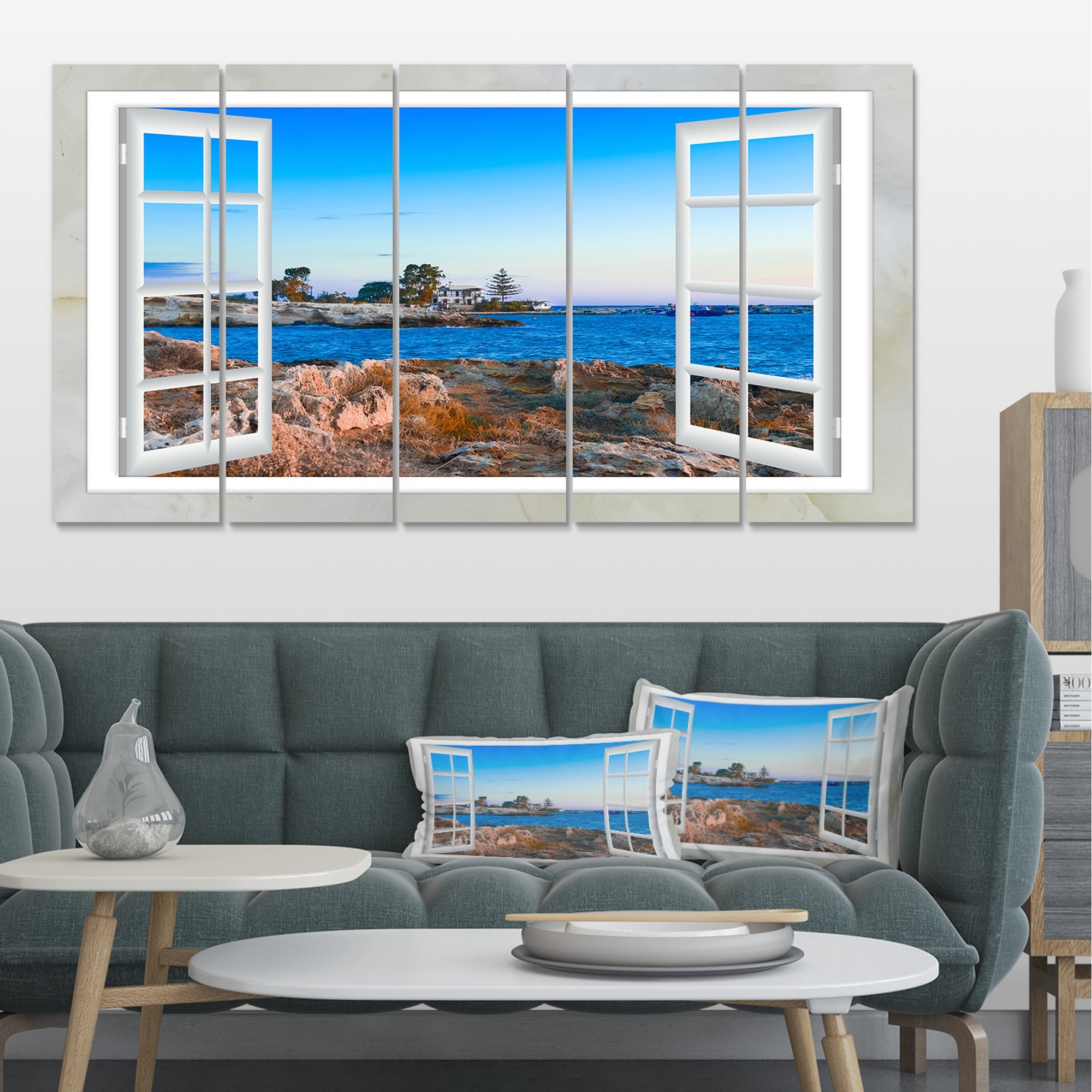 Designart "Open Window to Blue Seashore" Oversized Landscape Wall Art Print