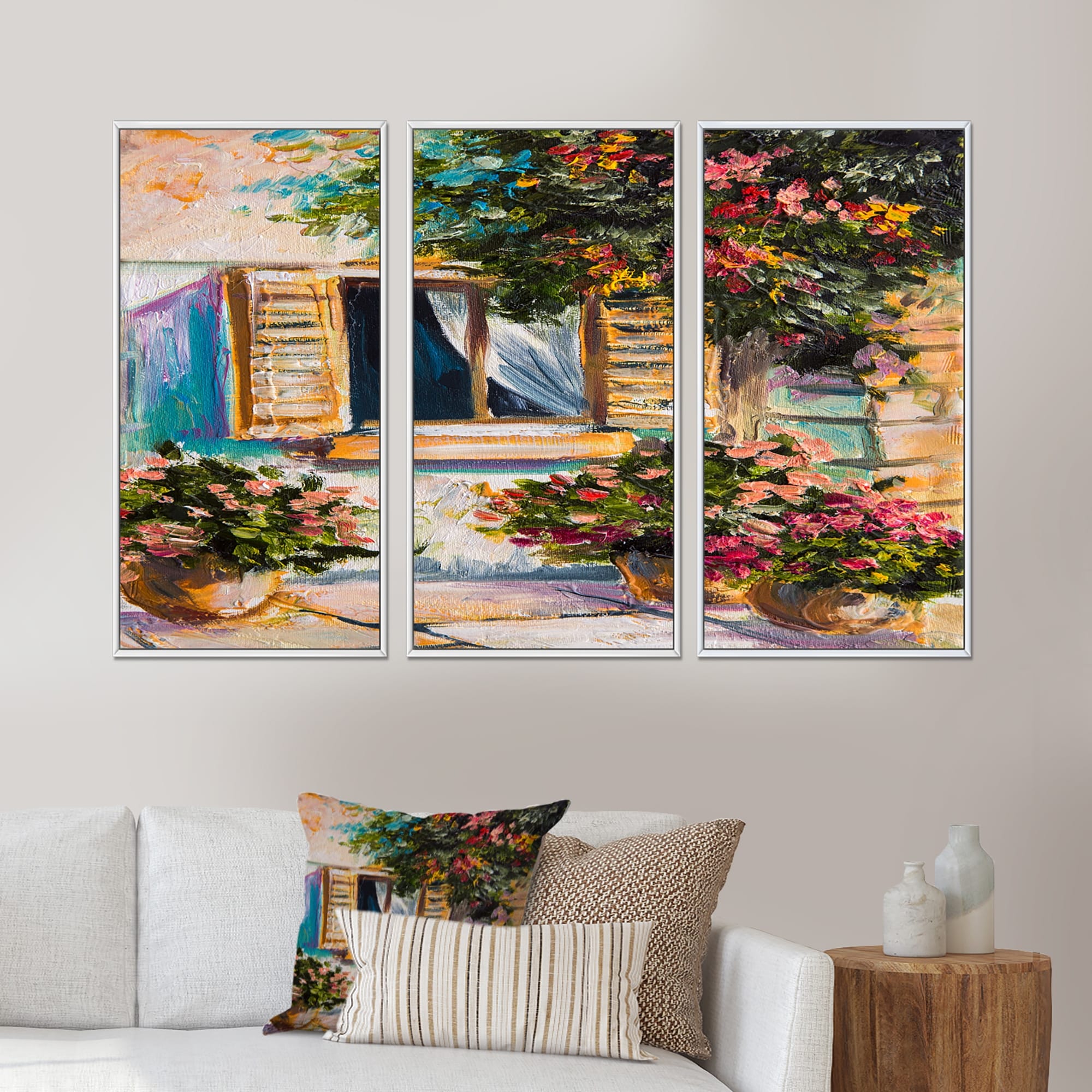 Designart "Open Window With Vibrant Flowers in Greek Street" Colonial Framed Canvas Wall Art Print Set of 3 - 4 Colors of Frames